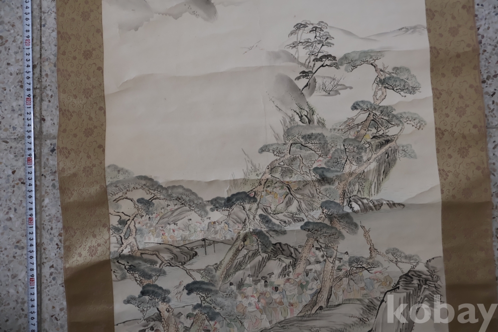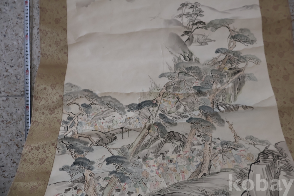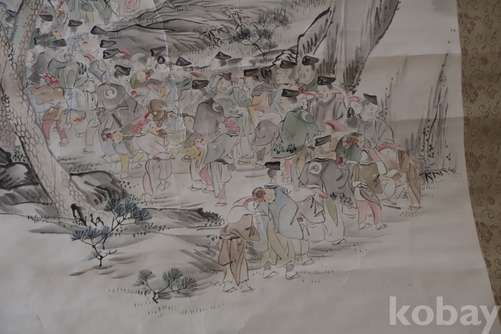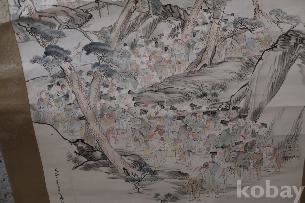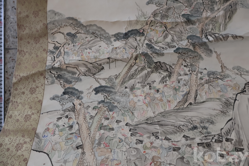제작 년도 를 가진 대형 족자 임니다 수많은 사람이 보이는 당대의 명화 임니다 사진 참조 하세요 대정 14년 1925 낙기가 보임니다 족자 밑부분에 세월 흔적이 보임니다 6번사진