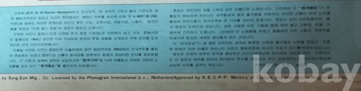 옛날 추억의 동요, 당시 해외공연을 돌며 유명했던 "선명회 어린이 합창단" 음반입니다. 쟈켓에 선명회에 대한 자세히 설명하고 있읍니다. 참 새롭습니다. 저는 그냥 수집만 하다보니 짐스러워 정리차원에서 올립니다 선명회음반/리틀 엔젤스를 몇장 이어 올리려고 하는 만큼 지켜 봐 주시고. 쟈켓과 음반 너무 좋아보입니다