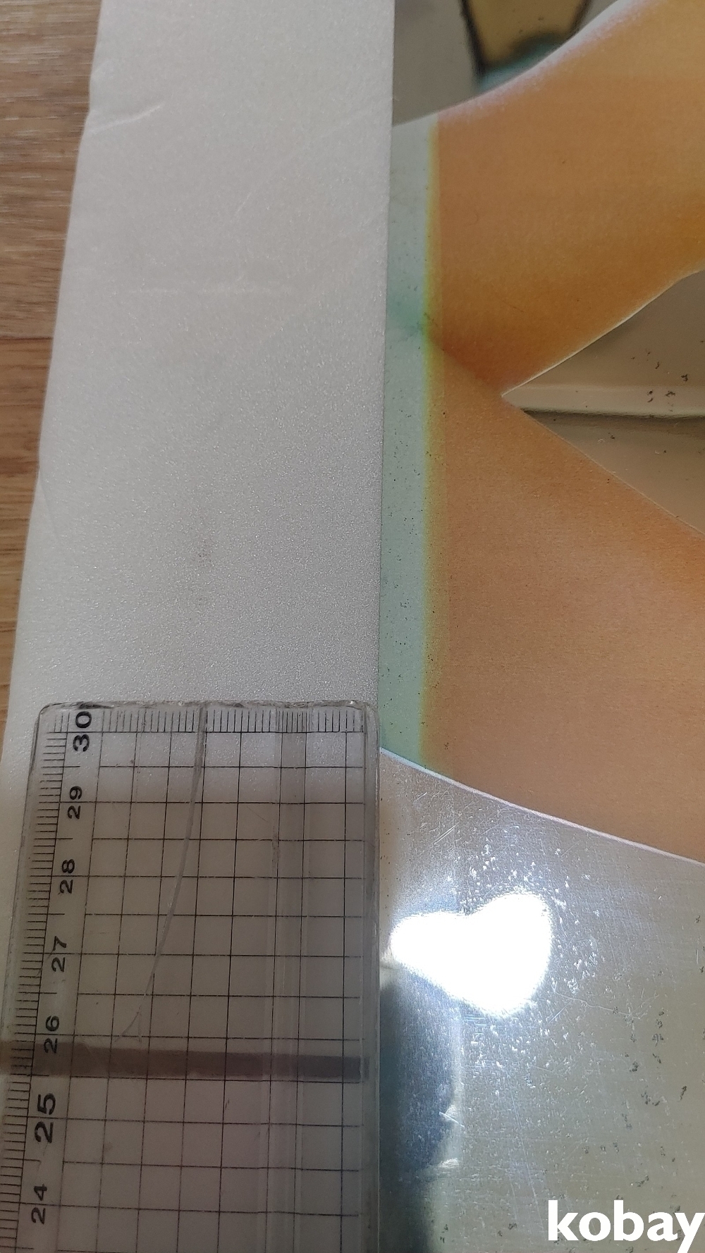 왼쪽 여성 팔 쪽에 자연적으로 변색 약간 보이며 모서리 쪽 재질 특성상 약간 구김 흔적 사진참조