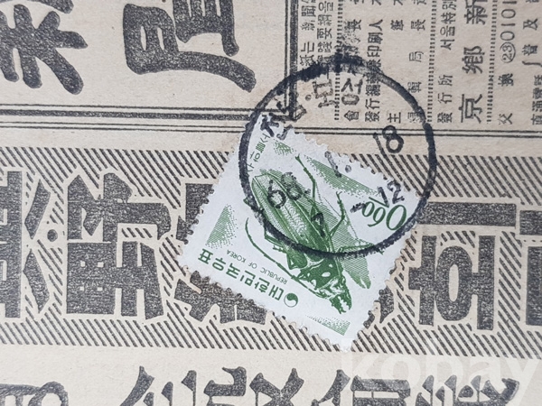 신문띠지로 발송된 것이나 주소를 적은 띠지는 없어지고 신문에 우표만 첩부된 것입니다.