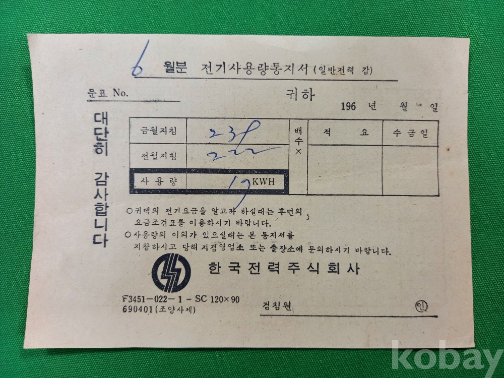 이 문서는 한국전력주식회사에서 발행한 오래된 전기사용량통지서(전기요금 고지서)입니다.