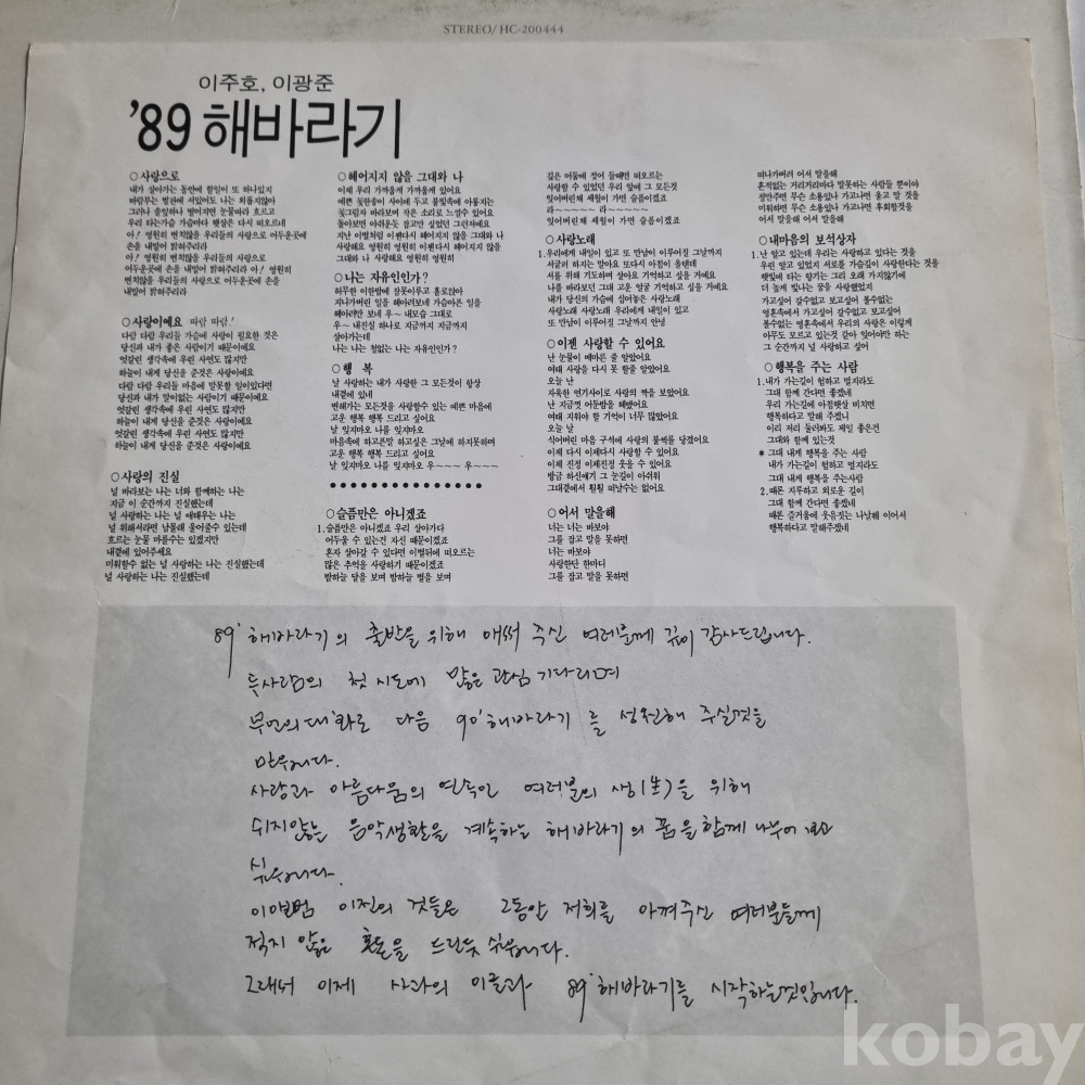 | 자켓상태 | VG : 주름, 접힘, 모서리 찢김 다수 | 음반상태 | VG : 생활 기스 다수, 가벼운 노이즈 존재 | 발매정보 | 초반 | 가사지여부 | 유 |