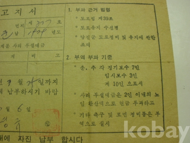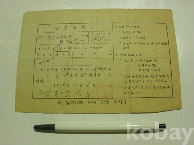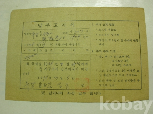 사리 부설대금 - 납부고지서 (1979년, 당진군 우강면장)