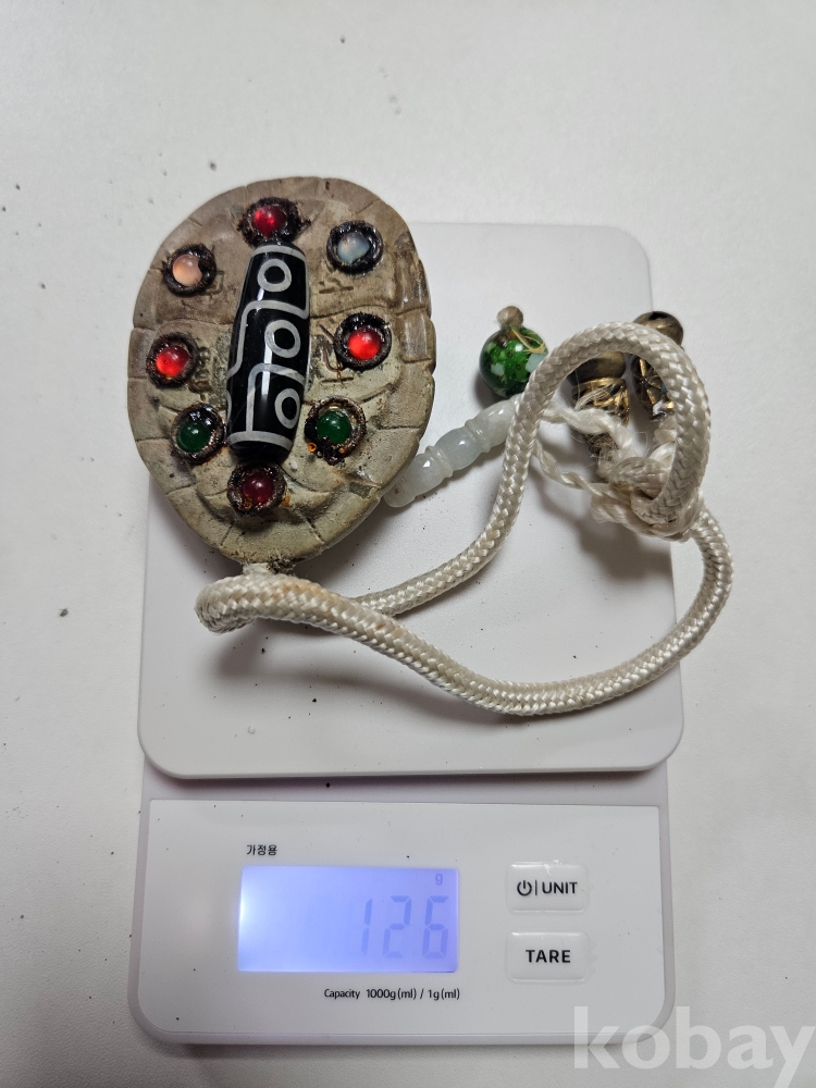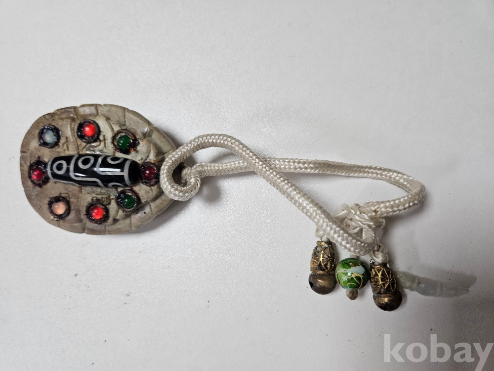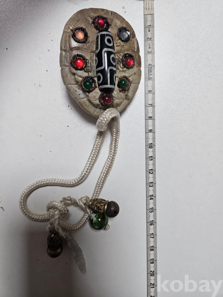 물건은 **티베트 고대 천주(天珠, Dzi Bead)가 박힌 독특한 형태의 거북이 등껍질 호신불(護身佛)**입니다. 거북이는 예로부터 장수, 보호, 지혜, 안정의 상징으로 여겨져 왔으며, 이러한 길상적인 의미가 천주의 강력한 기운과 결합되어 착용자에게 무한한 수호와 행운을 가져다줄 것이라 믿어집니다.