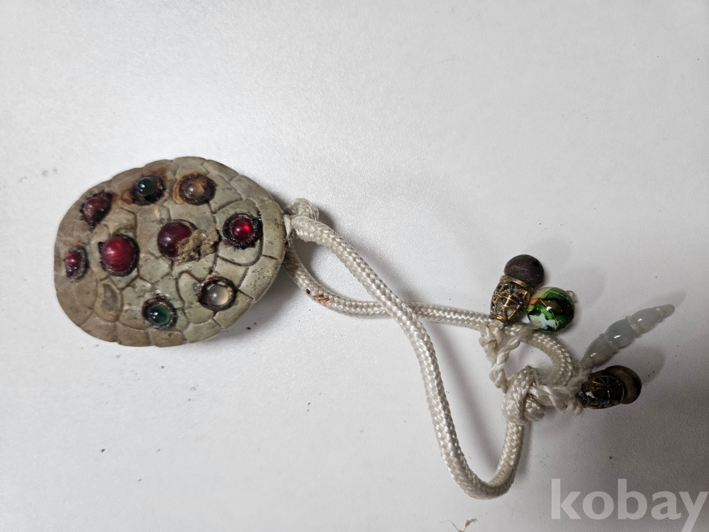 거북이 등껍질을 연상시키는 본체 주변으로는 다채로운 색상의 **보석류 또는 유리 구슬(붉은색, 녹색 등)**이 촘촘히 박혀 있어 전체적인 아름다움과 영적인 의미를 한층 더 강조합니다. 오랜 세월의 흔적이 느껴지는 고풍스러운 질감과 색감은 이 호신불이 지닌 깊은 역사와 스토리를 말해줍니다.