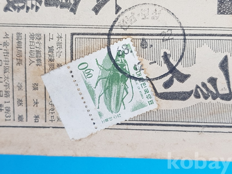 신문띠지로 발송된 것이나 주소를 적은 띠지는 없어지고 신문에 우표만 첩부된 것입니다.