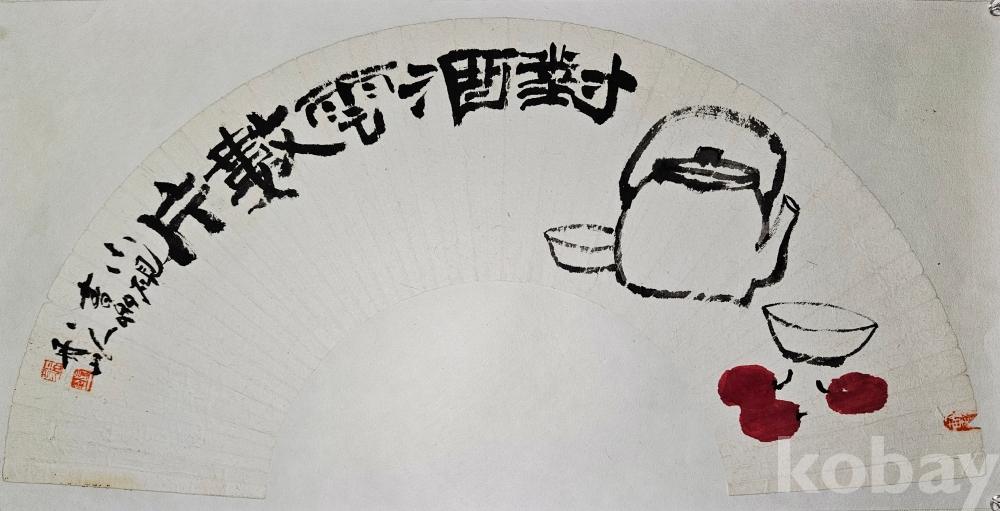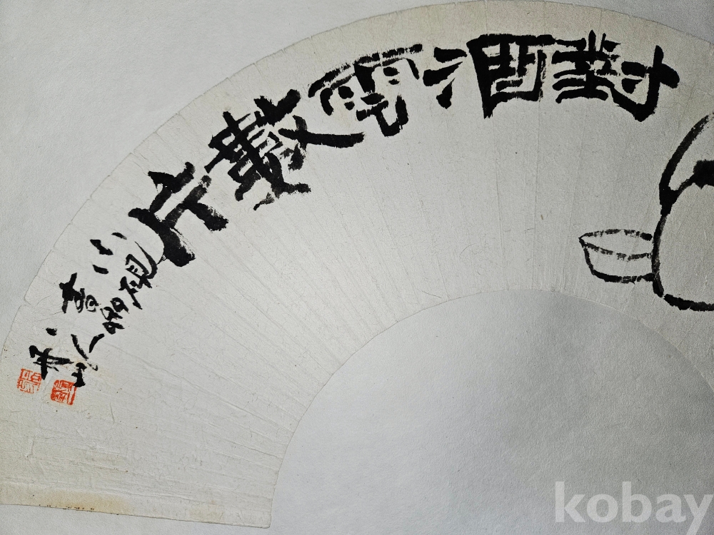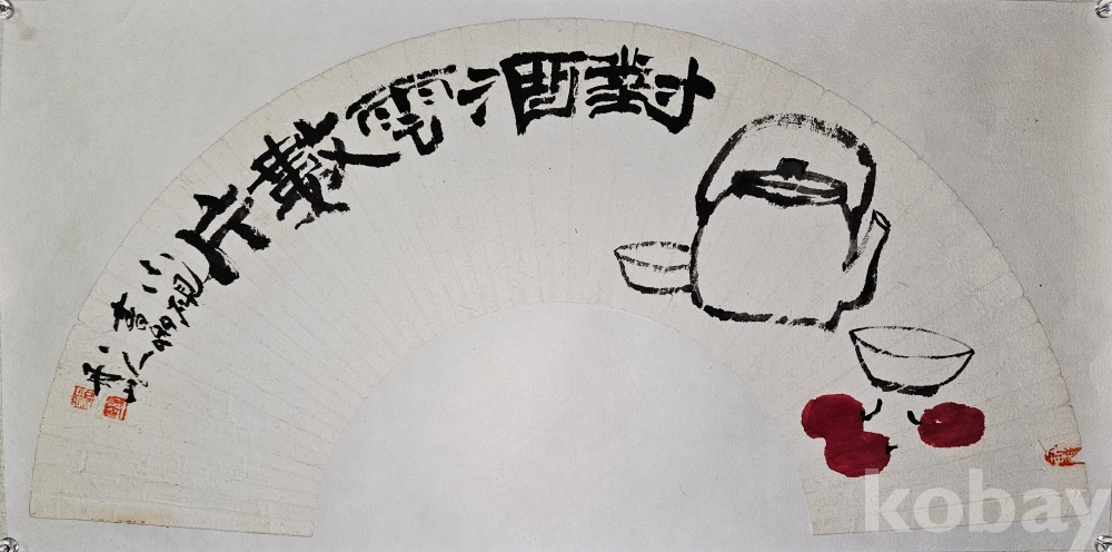 부채 형식 위에 굵고 힘 있는 서체로 문구를 배치하고,