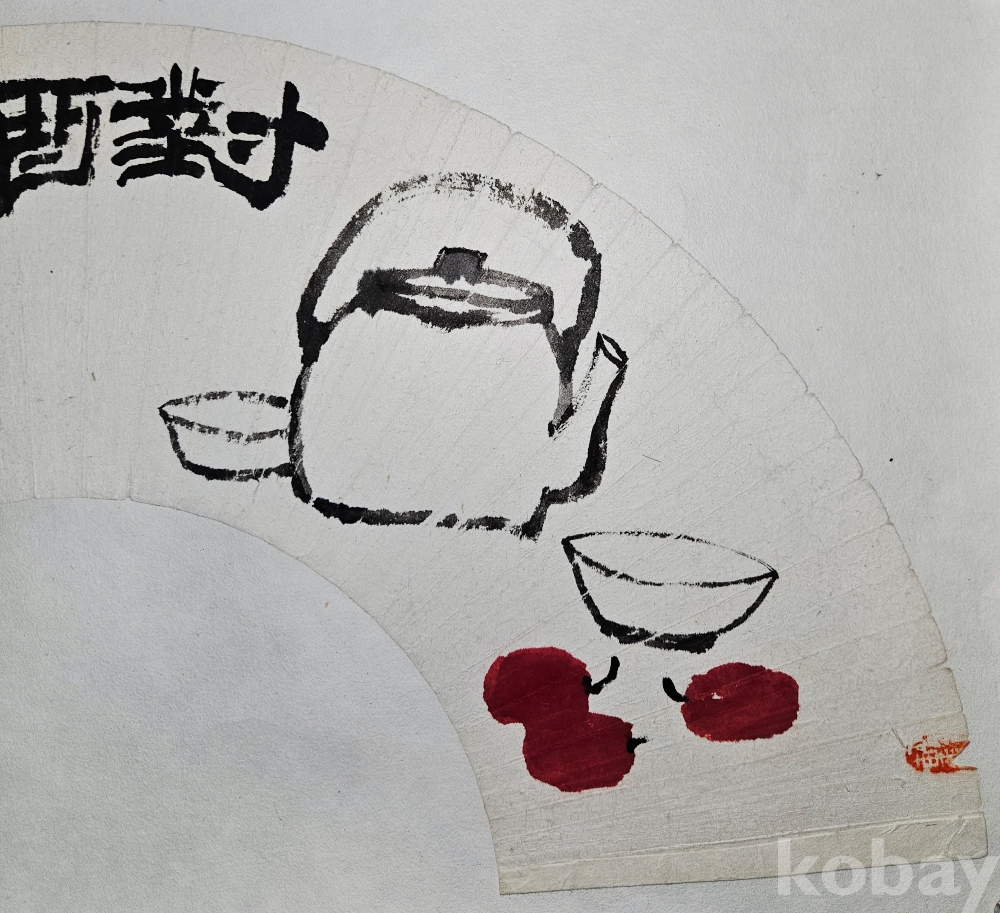 한쪽에는 주전자와 찻잔, 붉은 과실을 단순하게 그려 넣어