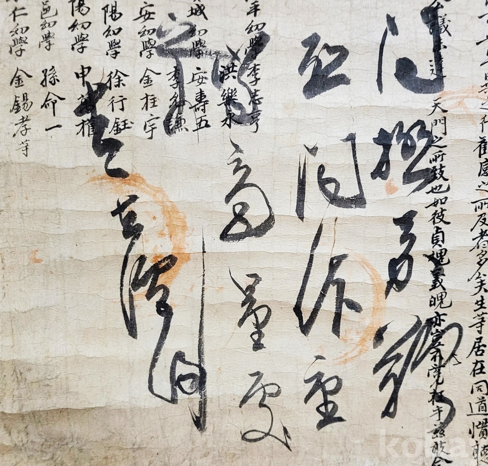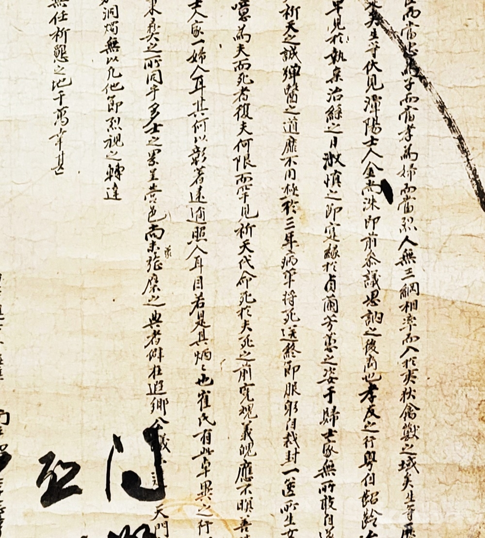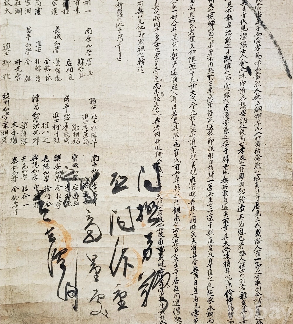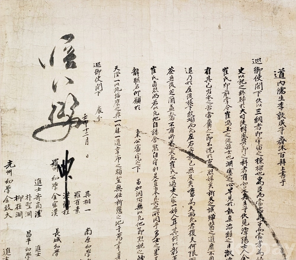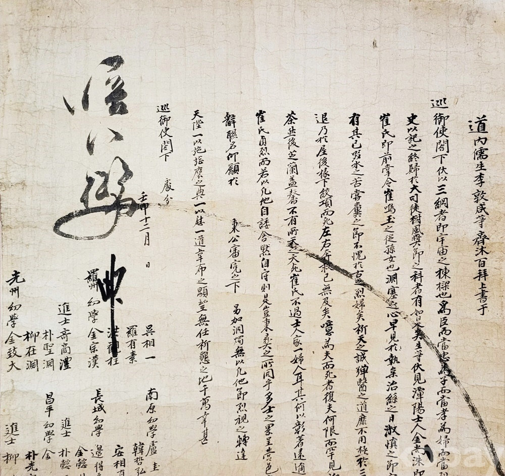 1812(壬申 純祖 12년))년 문서로 내용은 전라도 담양 潭陽 士人 金尙洙는 오랜세월 심신허약으로 그 처 崔氏가 온갖 정성것 돌봄에 烈婦로 그 행적을 李敦咸이 전라도 여러 곳의 진사 유생 선비들 연명 작성 상서하여 巡御使의 처분을 받았던 내용입니다.
