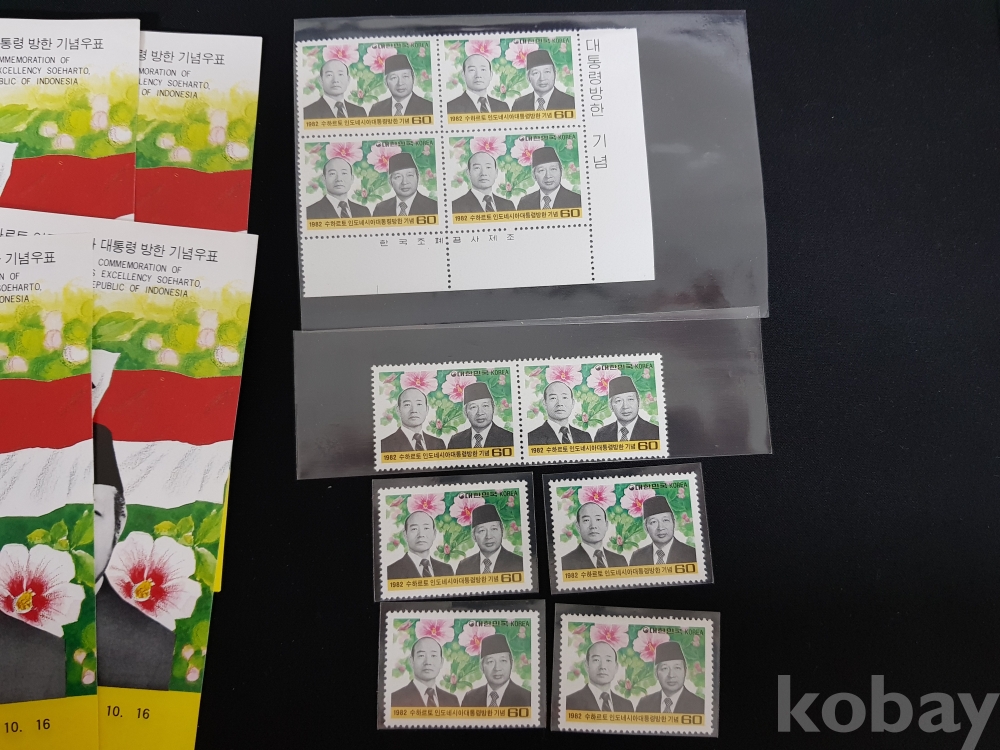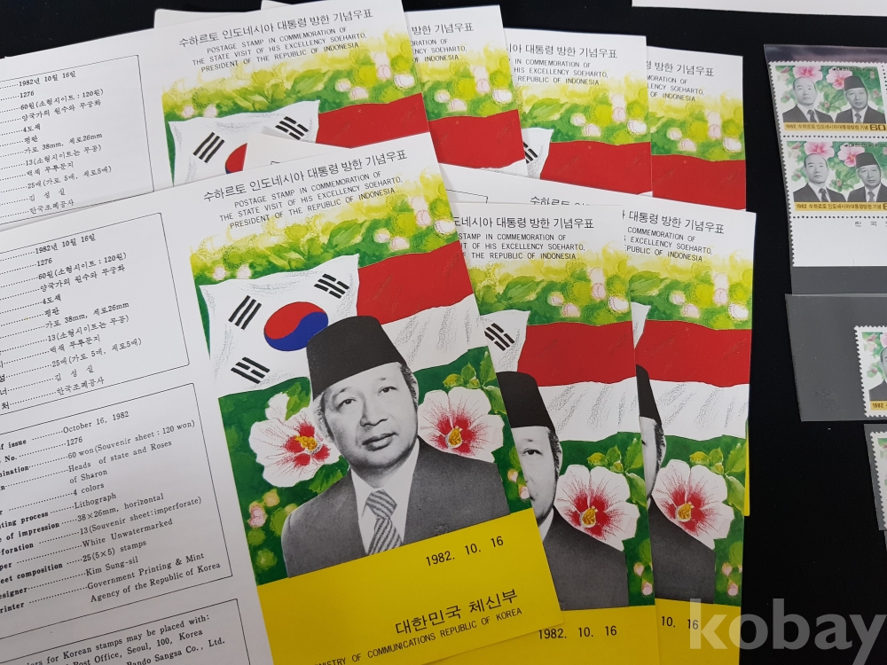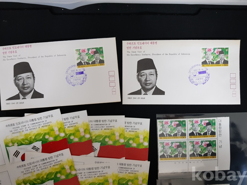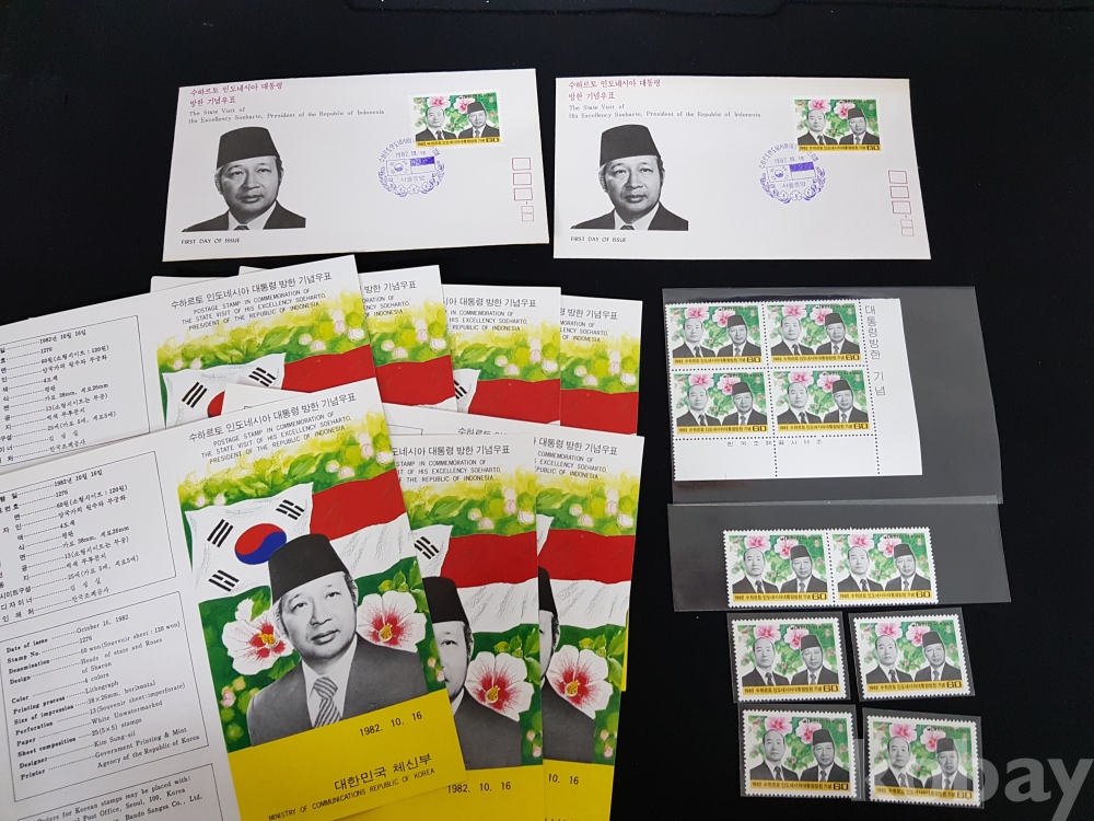 - 1982년 수하르토 인도네시아 대통령 방한 안내카드, 초일봉피, 명판 등 모음