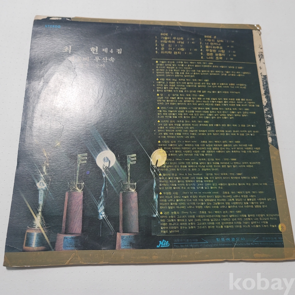 | 자켓상태 | EX : 약간의 마모, 모서리 찢김 존재 | 음반상태 | EX : 재생에 영향 없는 가벼운 기스 존재 | 발매정보 | 알수없음 | 가사지여부 | 무 |