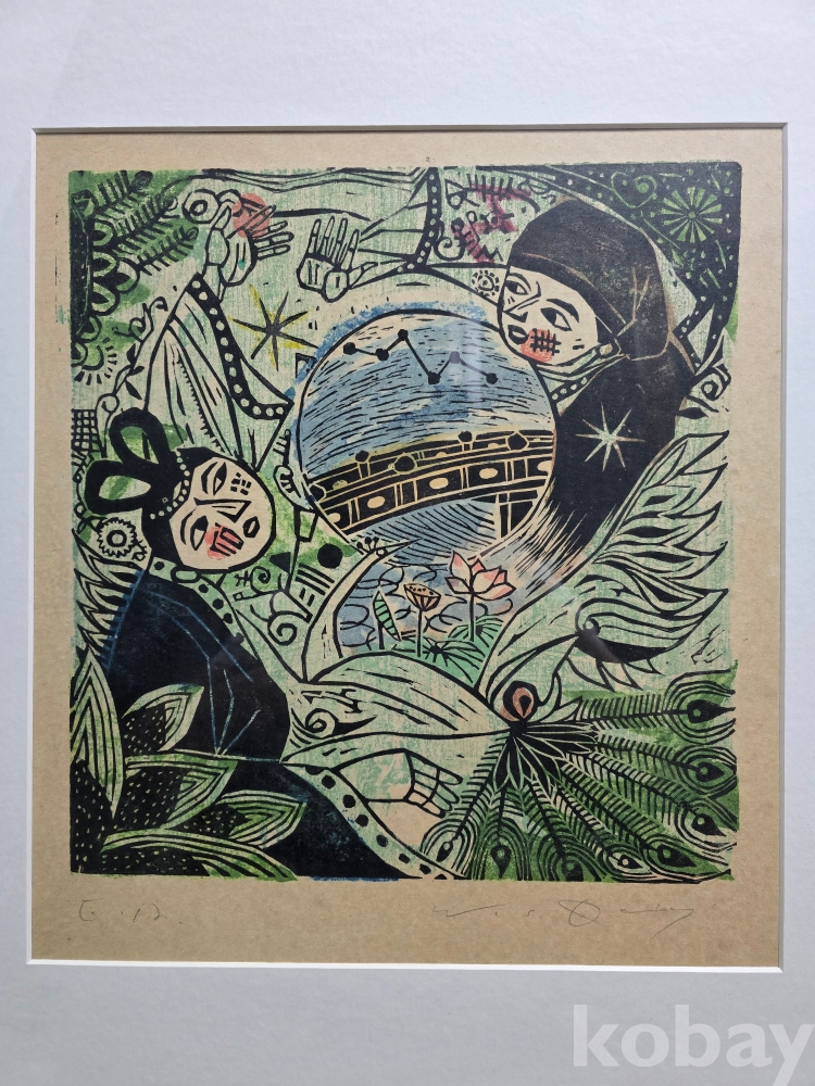 견우와 직녀의 설화를 현대적으로 재해석한 목판화입니다