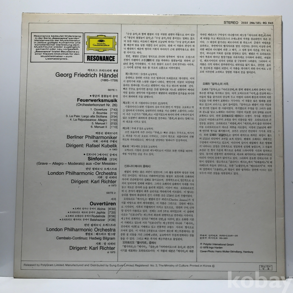 LP 17,010-17 Georg Friedrich Händel - Feuerwerksmusik _ 자켓 EX+ 알판 EX+ 86 년 국내반