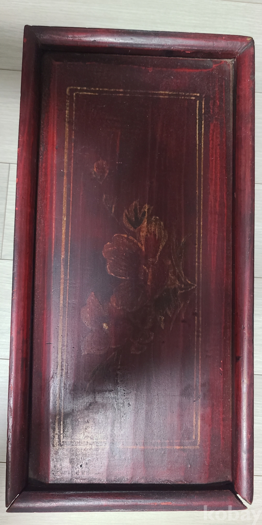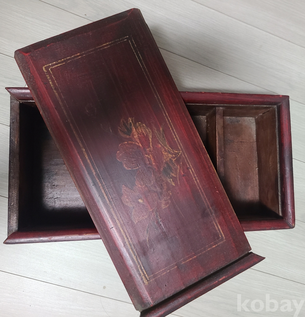 깊고 은은한 붉은색 바탕에 고풍스러운 **꽃 문양(추정: 난초, 매화, 모란 등 수묵화 풍)**이 금빛 또는 황토빛 선으로 섬세하게 그려져 있어 예술적인 가치를 더합니다. 세월의 흐름에 따라 자연스럽게 바랜 색감과 질감은 이 함이 지닌 깊은 멋과 이야기를 보여줍니다.
