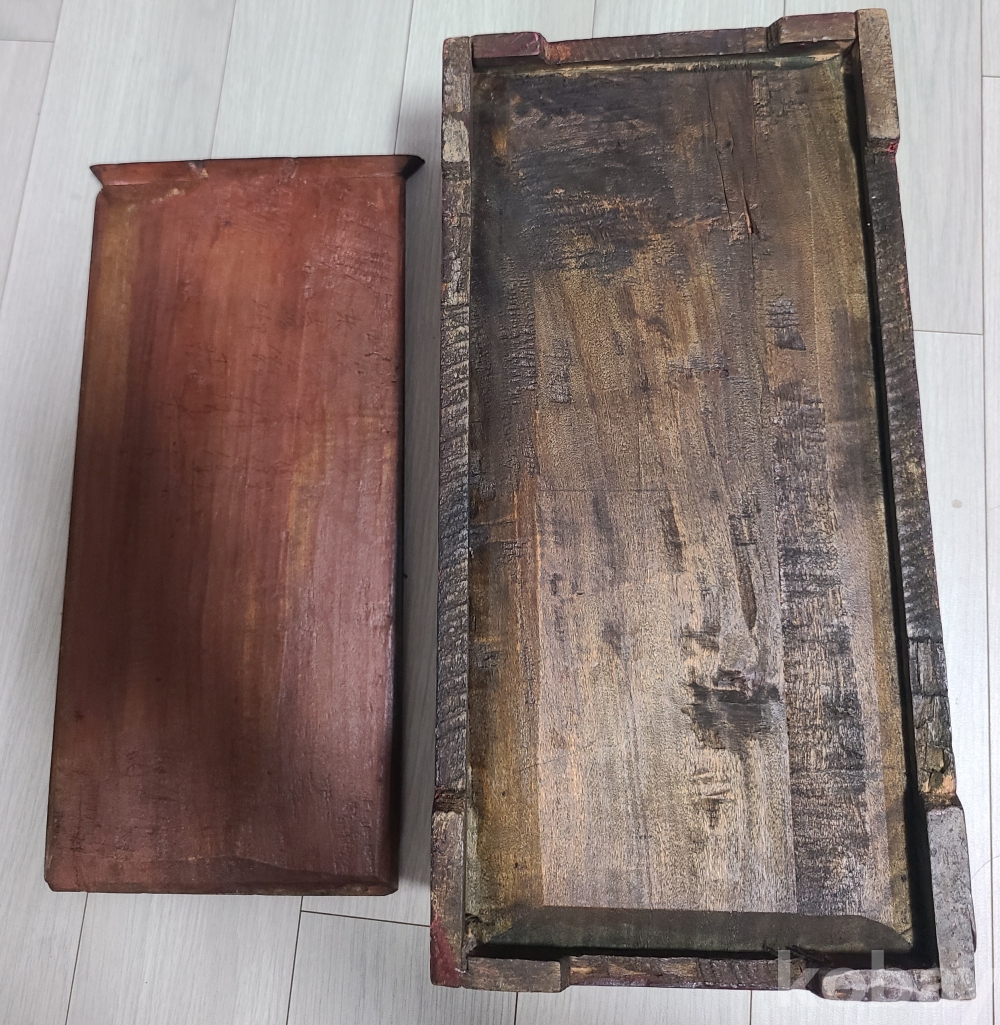 뚜껑을 열면 내부에는 벼루와 먹 등을 효율적으로 보관할 수 있도록 칸막이가 마련되어 있습니다. (사진상으로는 왼쪽 큰 칸과 오른쪽 작은 칸으로 나뉜 것이 보입니다.) 견고하게 짜여진 나무의 결이 살아있으며, 전반적으로 품격 있는 분위기를 자아냅니다.