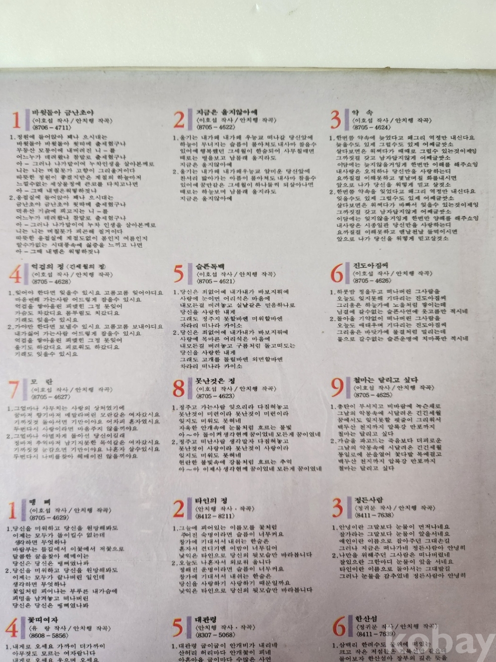 | 자켓상태 | EX : 약간의 마모, 모서리 찢김 존재 | 음반상태 | EX : 재생에 영향 없는 가벼운 기스 존재 | 발매정보 | 알수없음 | 가사지여부 | 무 |
