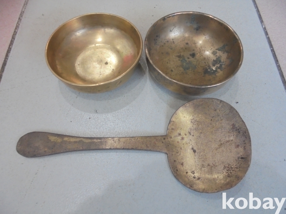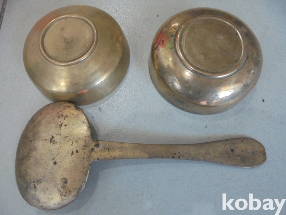 오래되고 작아서 앙증스러운 질들은 유기밥주걱과 오래된 두텁고 무거운 귀한 유기 반찬그릇 2점