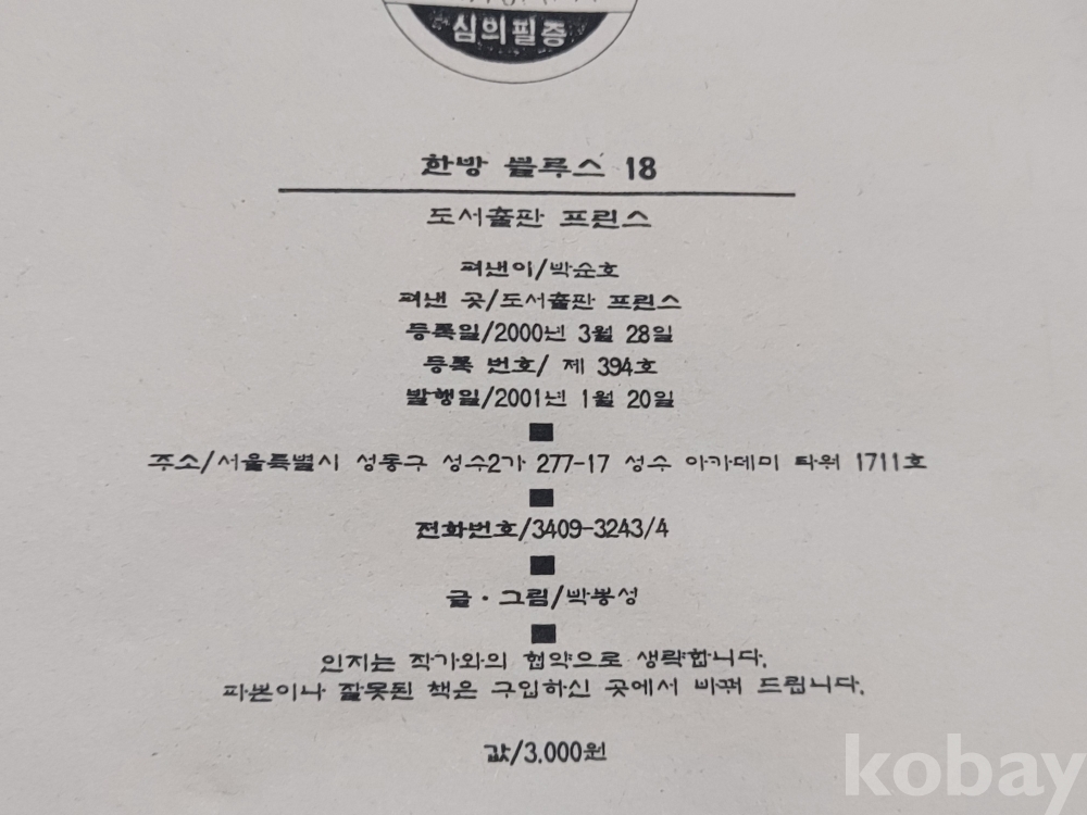 < 한방 블루스 (총18권 완결) / 박봉성 글.그림 >