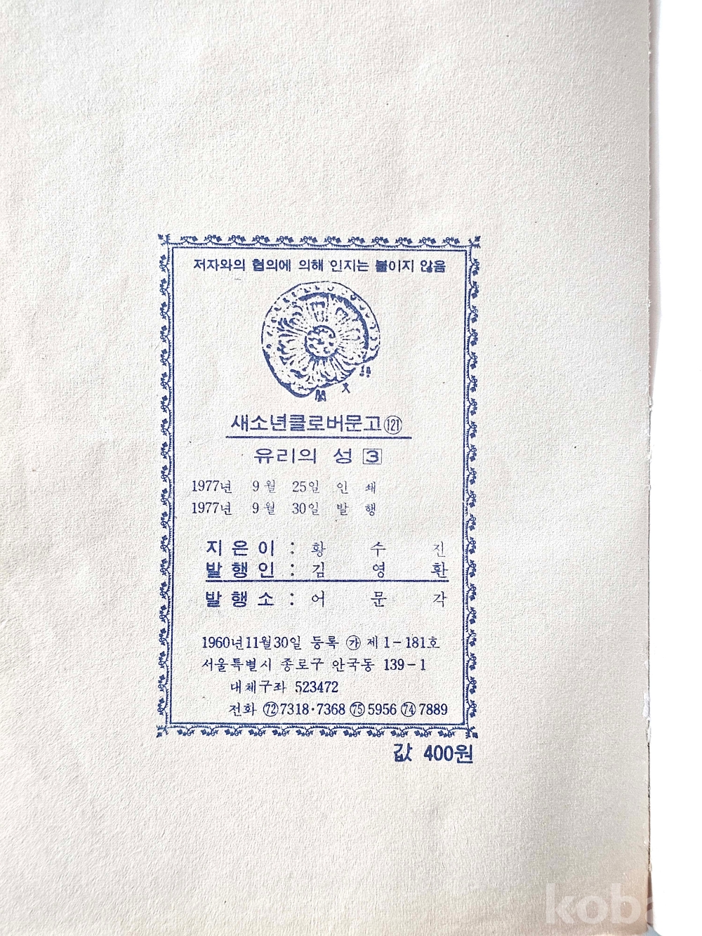 물 품 명 | 유리의 성 3편 / 황수진 만화 / 1977년 / 어문각 |