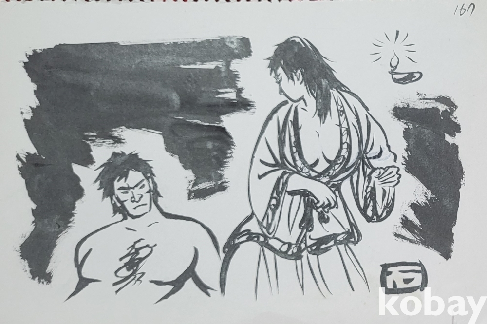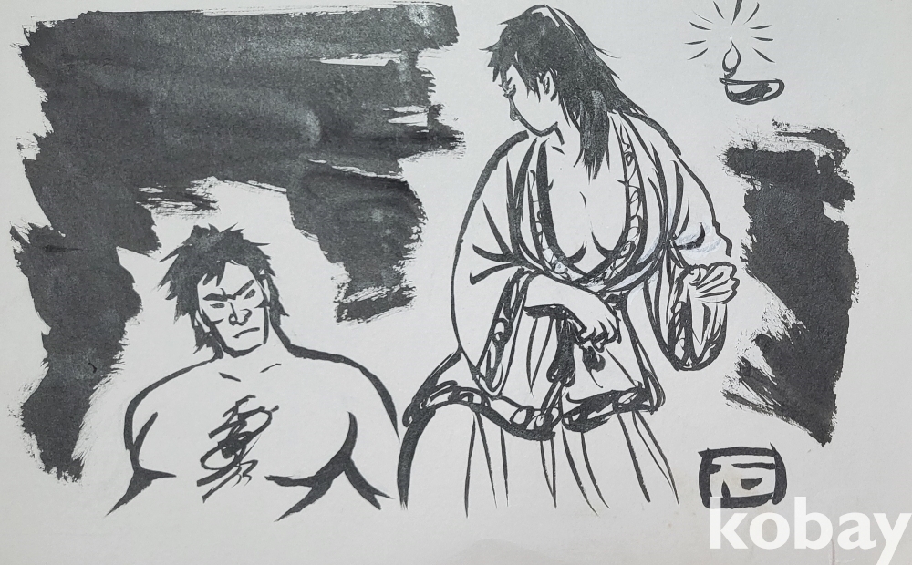 물과 먹으로 만 직접 그려진 수묵화 삽화입니다,