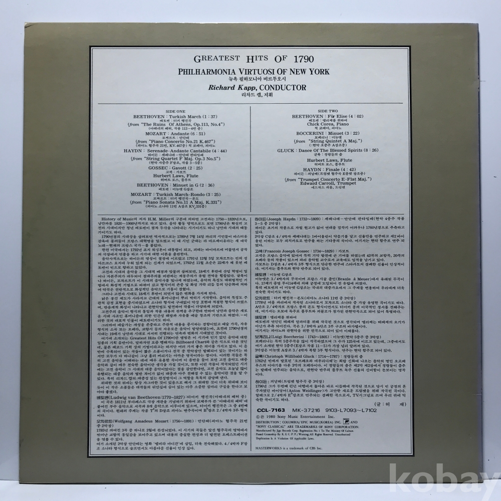 LP 85,000-85 Richard Kapp - Greatest Hits of 1790 . 자켓 EX+ 알판 EX 91 년 국내반