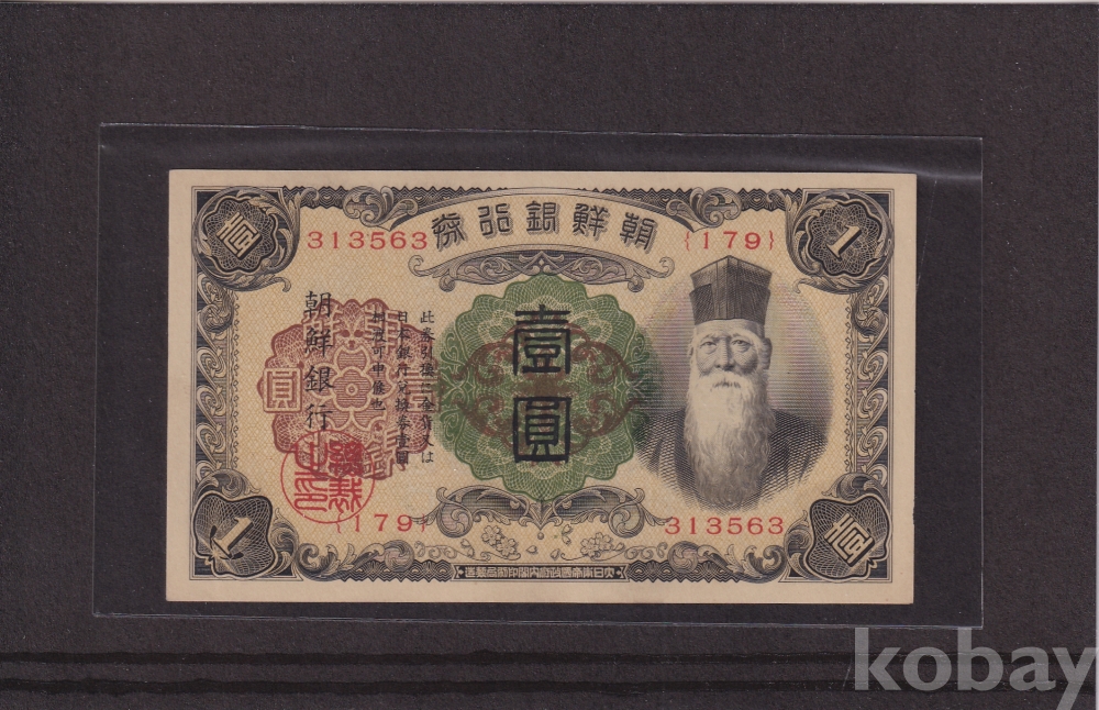 - 조선은행 1932년 개 일원 판번호 179번 유번호권 준미(+) 지폐