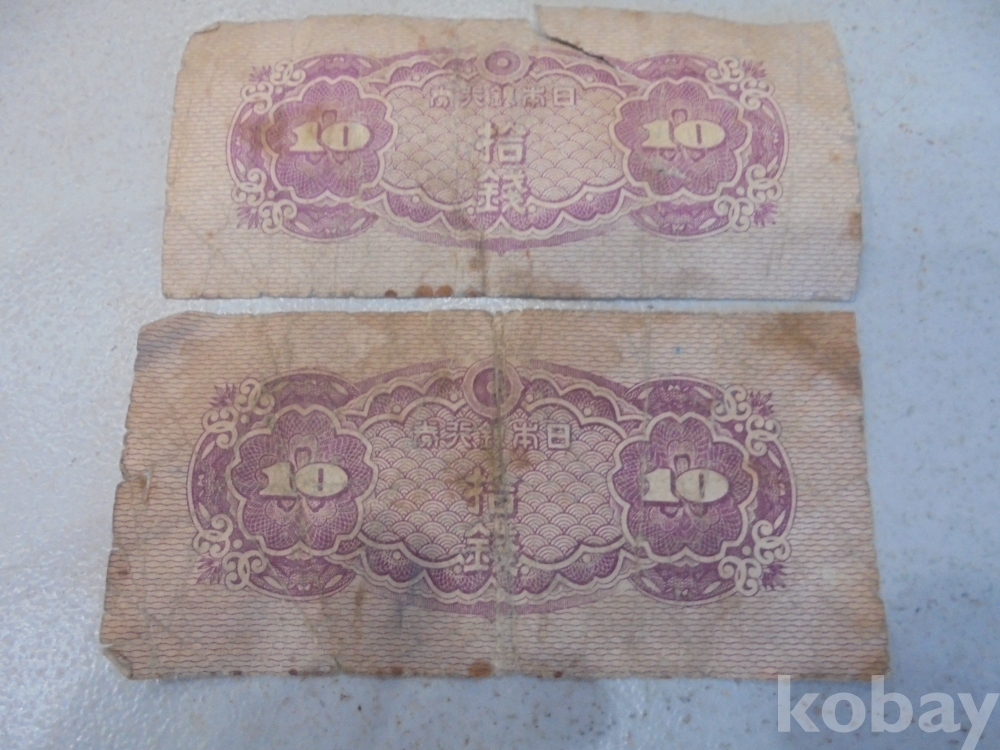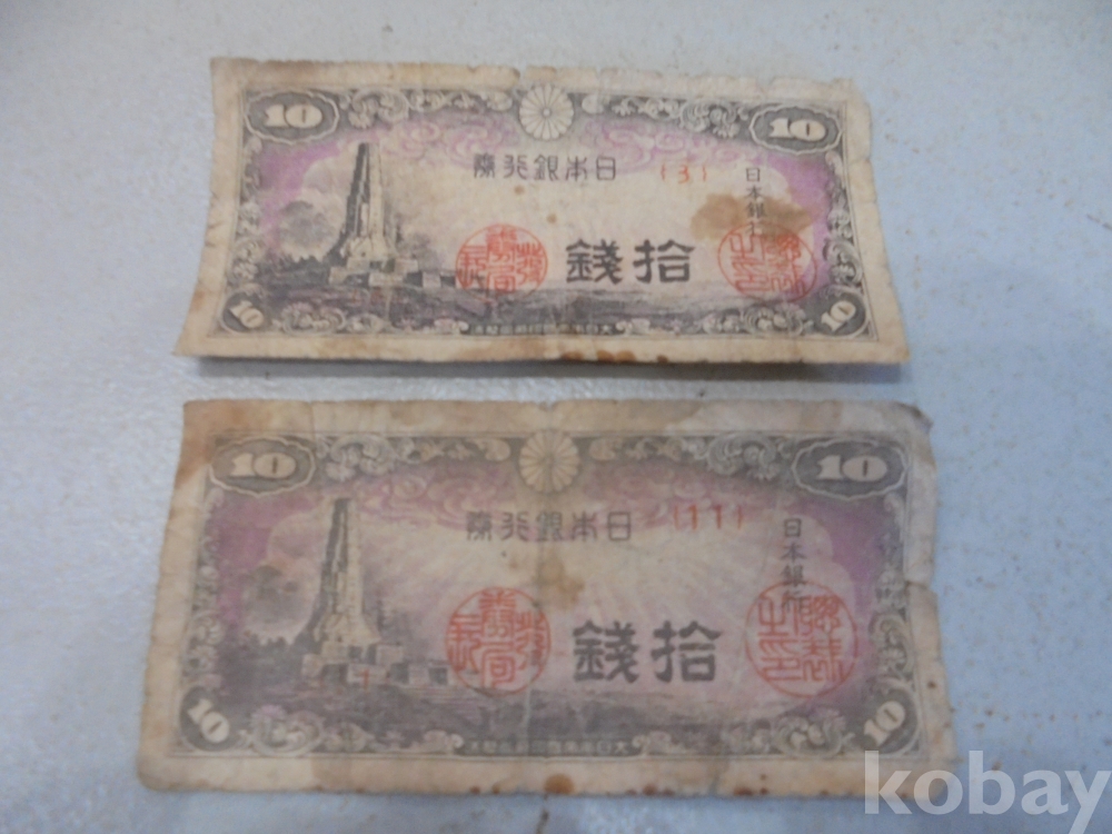 앞면에 일본최고탑같은것과 일본은행권 拾錢과 도장도장이 2개있고 뒷면 불은색에 10과 拾錢 당시는 먼저나온지폐로 보이는 왜정시대 사용하여