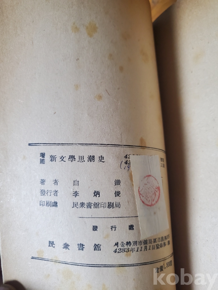 1. 신문학사조사, 백철, 민중서관, 1957년, 371쪽, 상태 상, 사진 참조