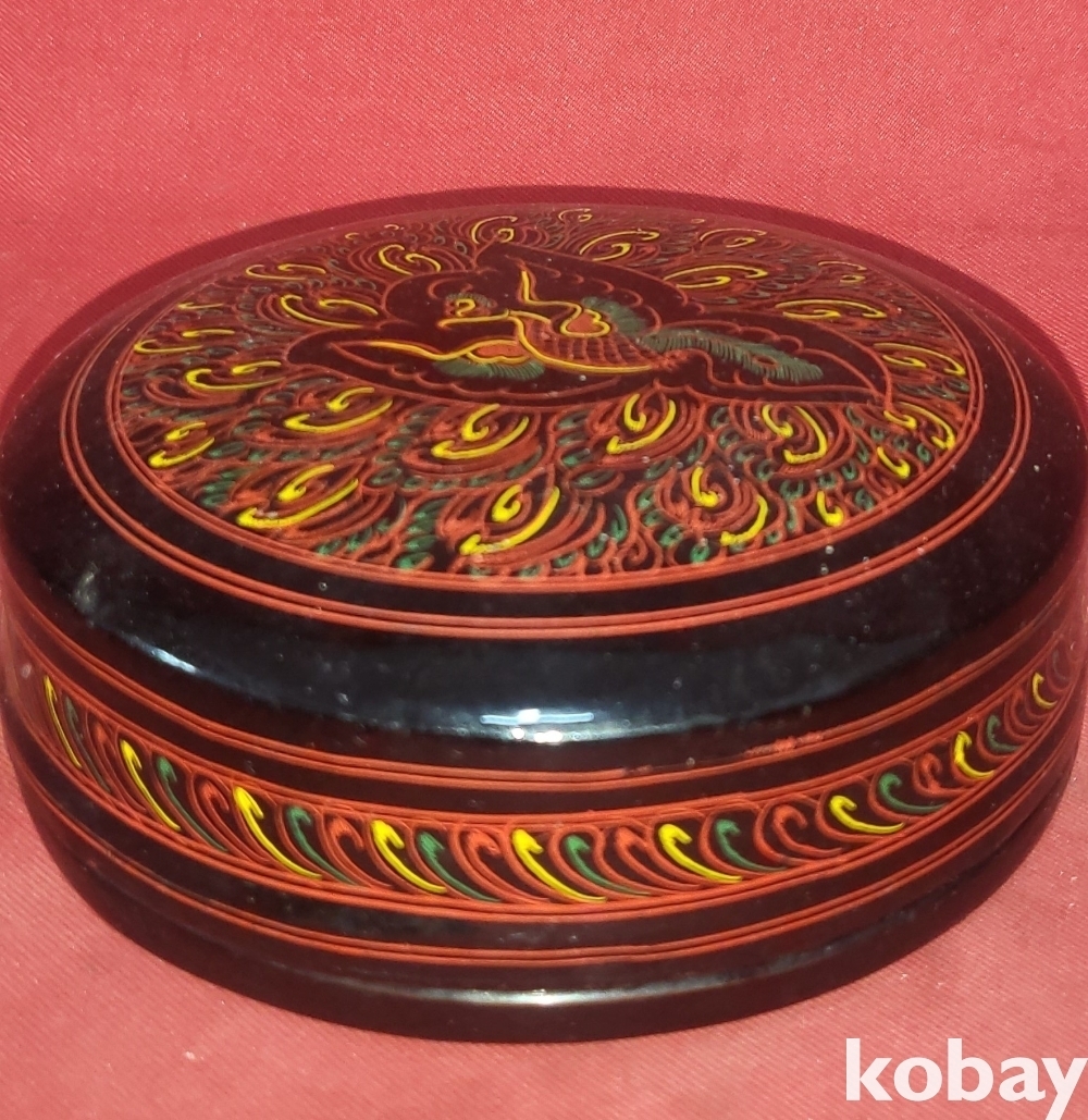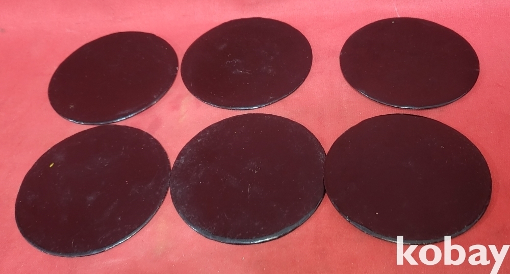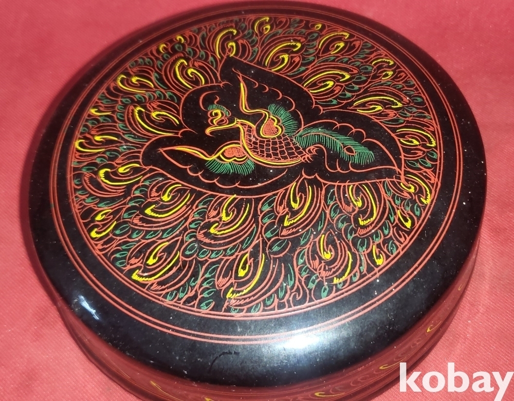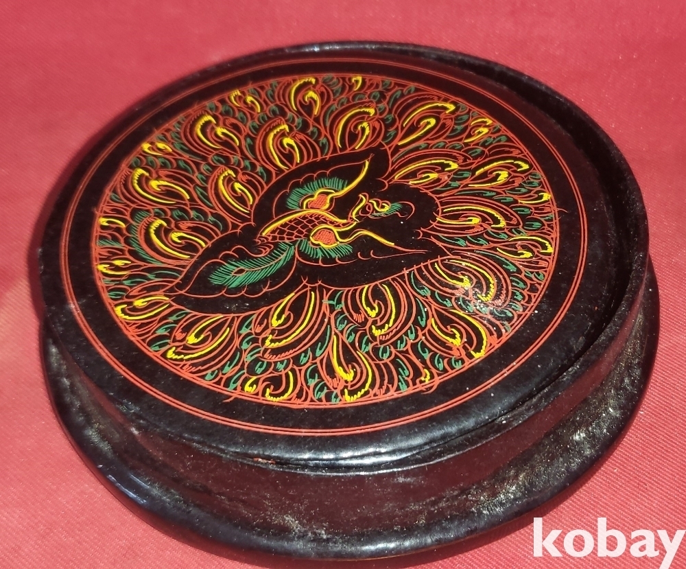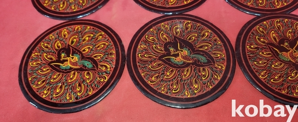나무에 옻칠마감된 봉황문양 찻잔 받침대 6 개 미사용 입니다,