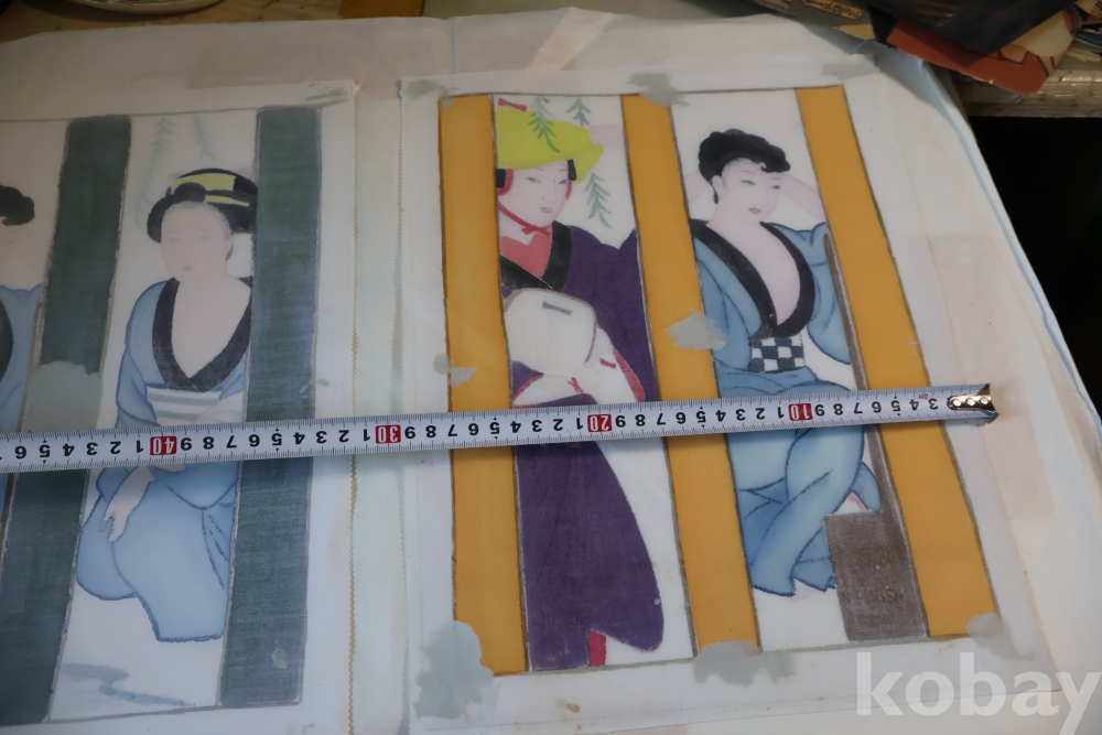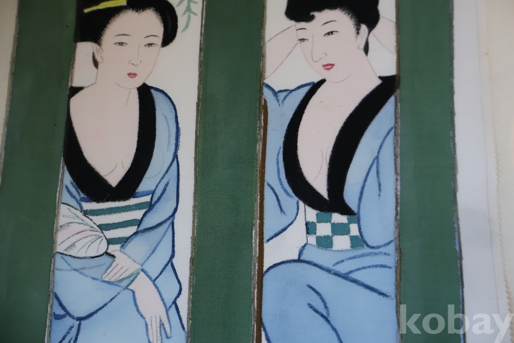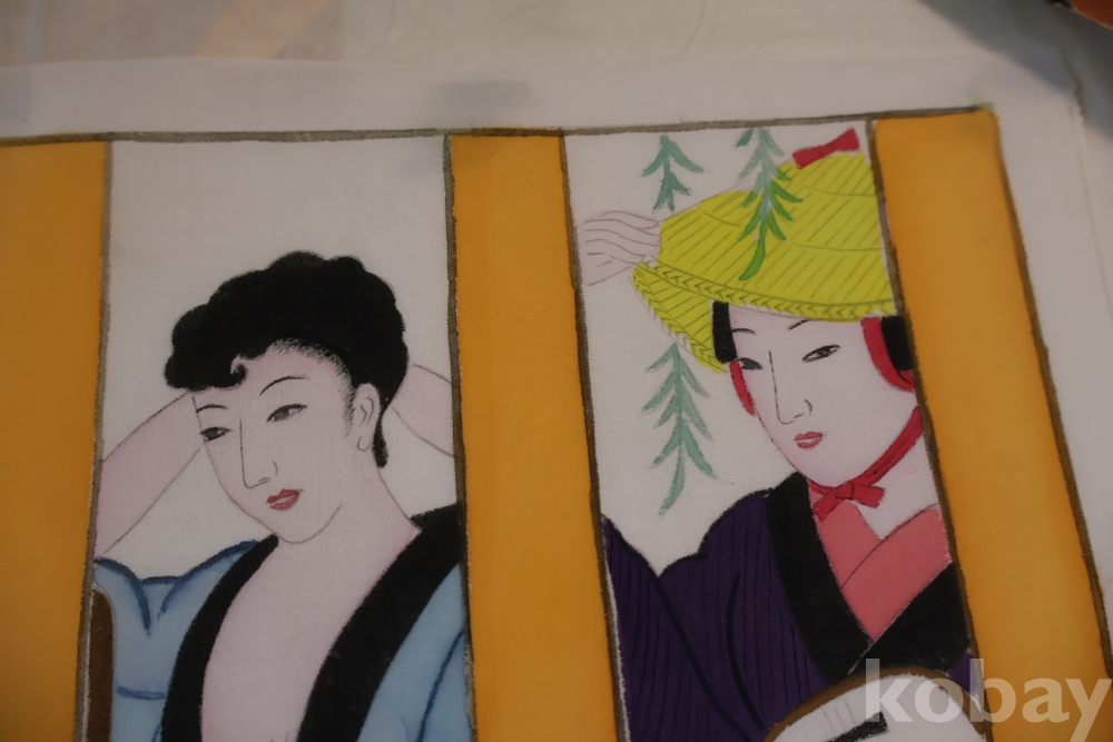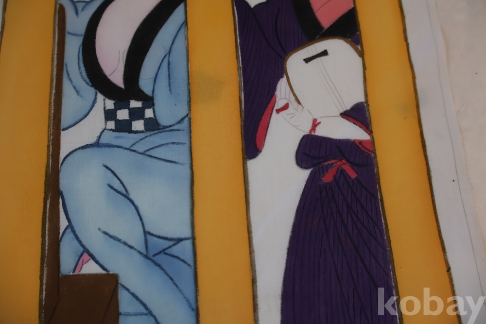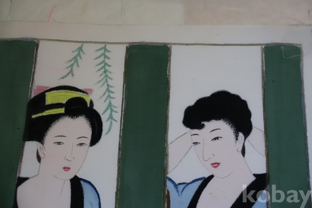 아름다운 일본 게이샤 임니다 밝은 색감 멋진 디자인 뒤에는 배접의 종이가 보임니다 사진 참조 하세요