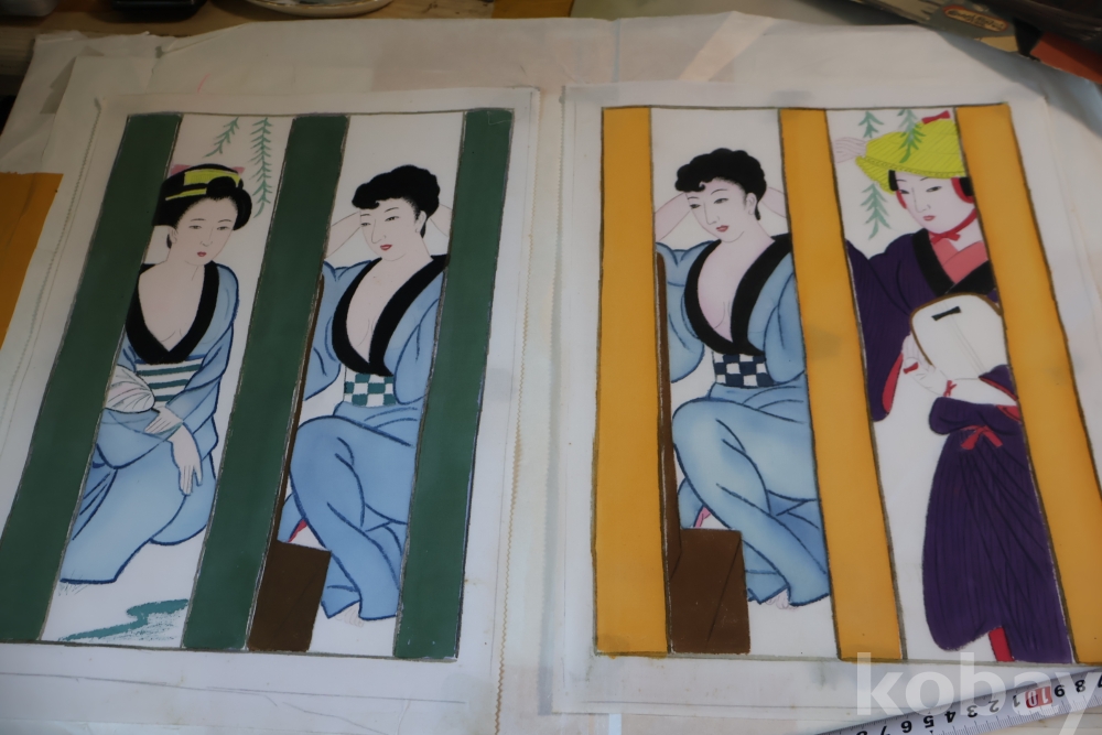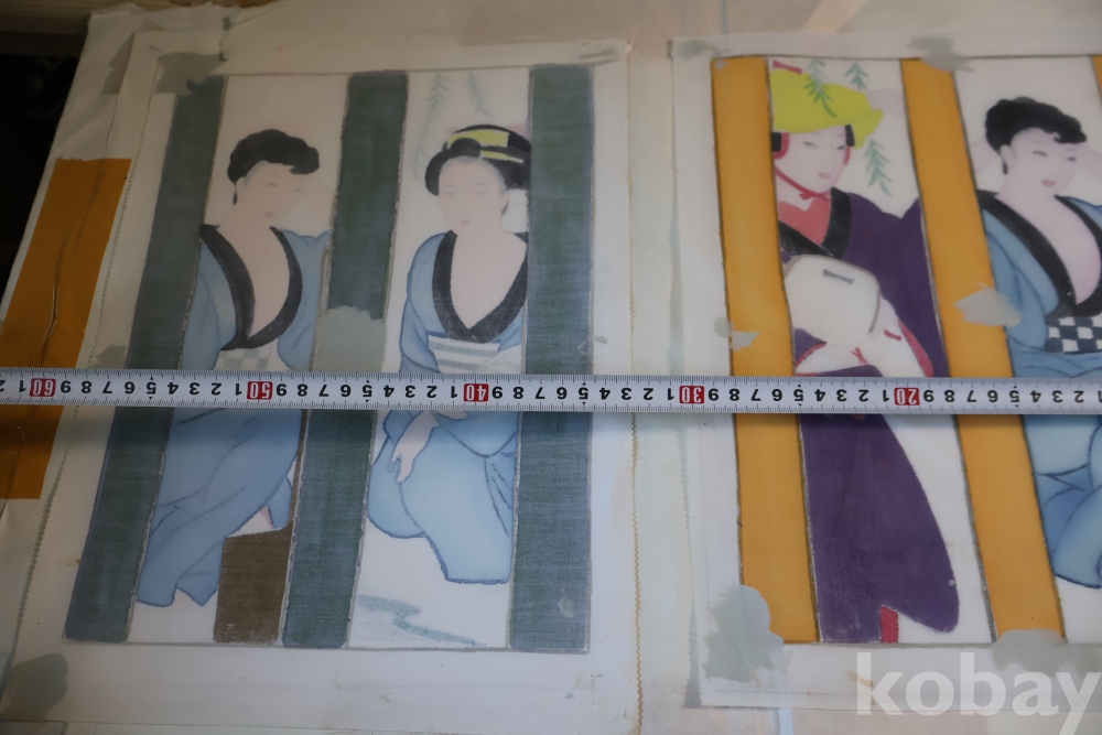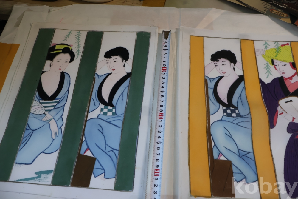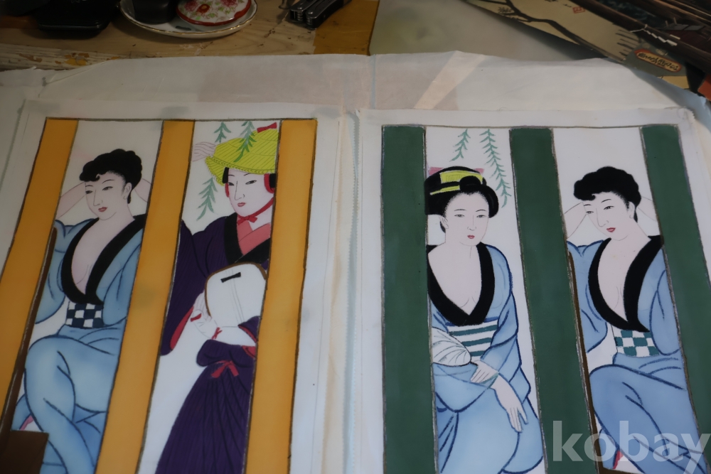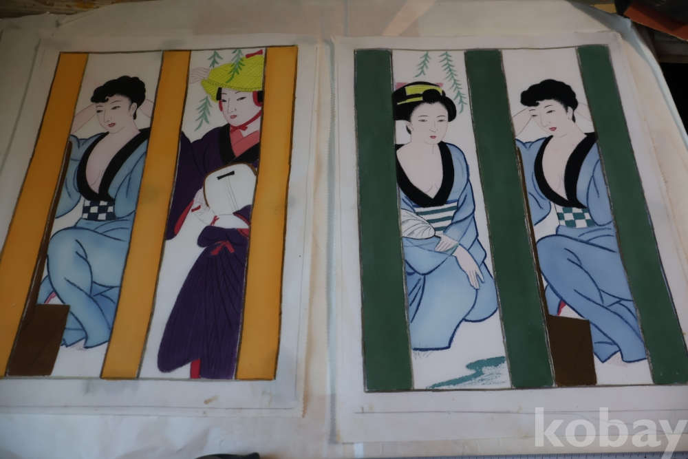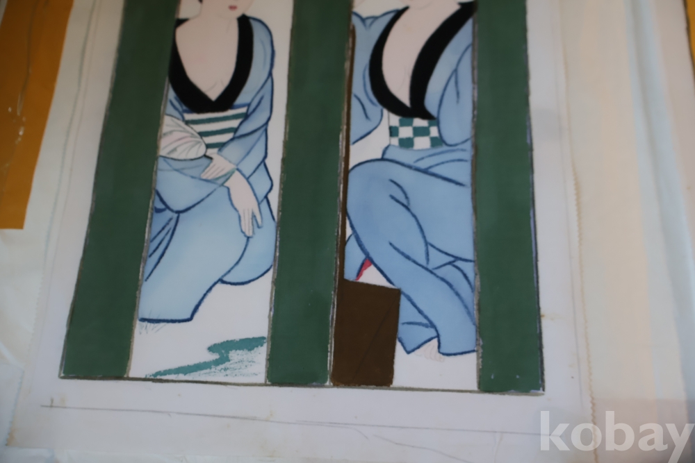 아름다운 일본 게이샤 임니다 밝은 색감 멋진 디자인 뒤에는 배접의 종이가 보임니다 사진 참조 하세요