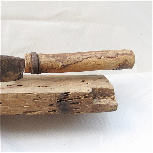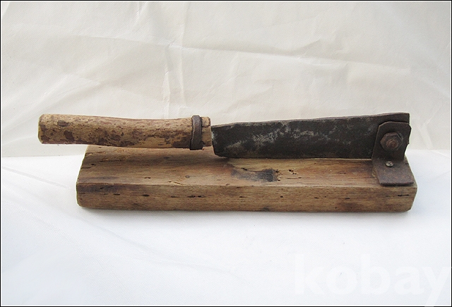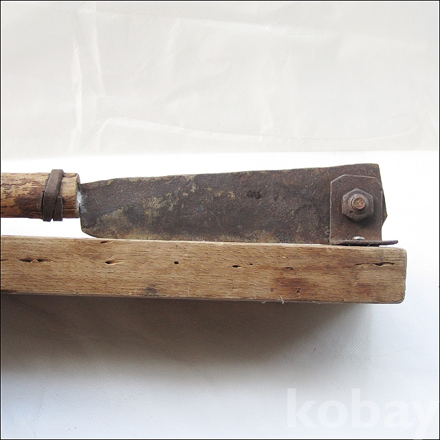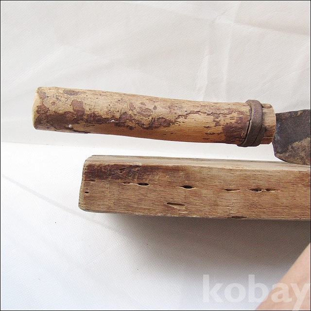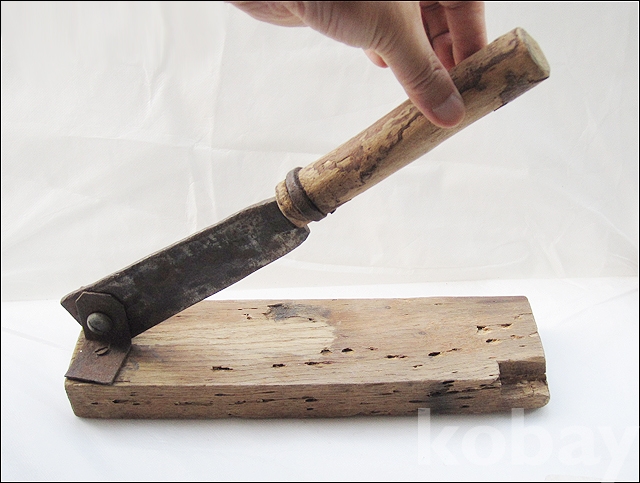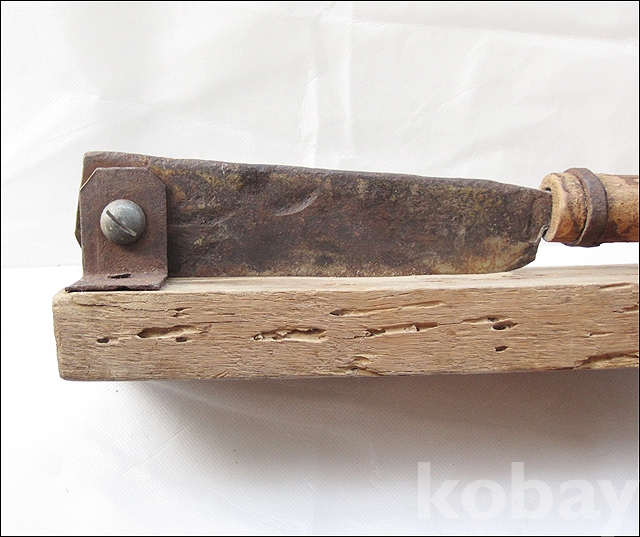 작두 손잡이 쪽 하단 받침의 깍인 부분은 발가락으로 밟기 위해서 고정용으로 깍은 것으로 보입니다. 탈락 아닙니다.