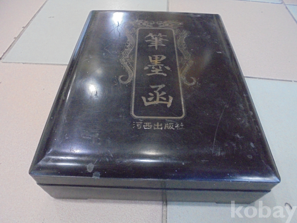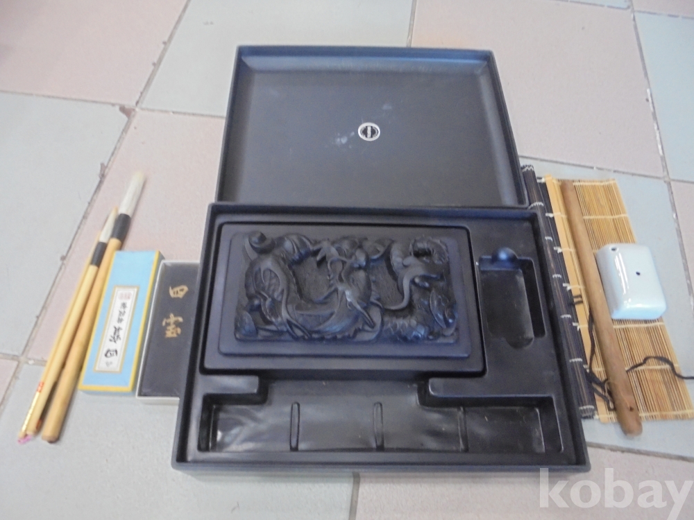 년대가된 필묵함속에 용무늬뚜껑과 4보마크 먹 백자연적 섬세한대나무붓싸개 큰붓 중간붓 세필붓 3점 외1점 미사용한 필묵함일체 1틀