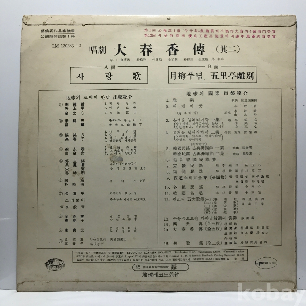 LP 83,840-58 판소리 춘향전 전집 其2 . 자켓 EX 알판 EX 국내반