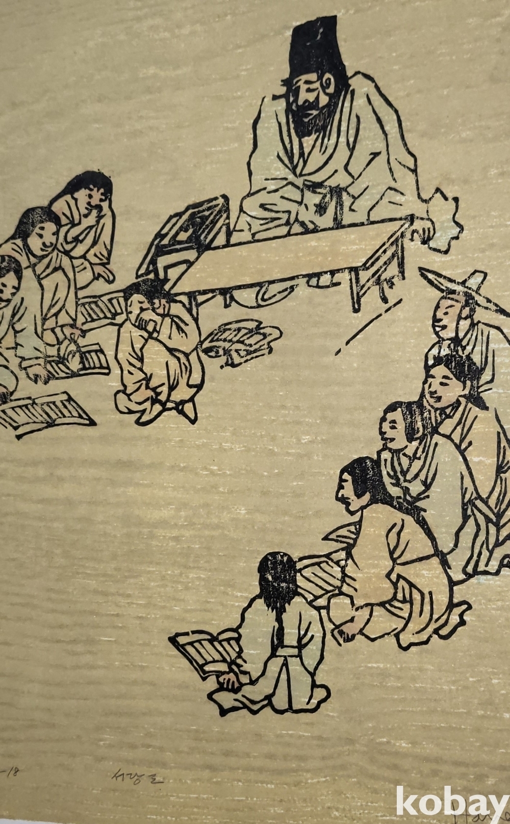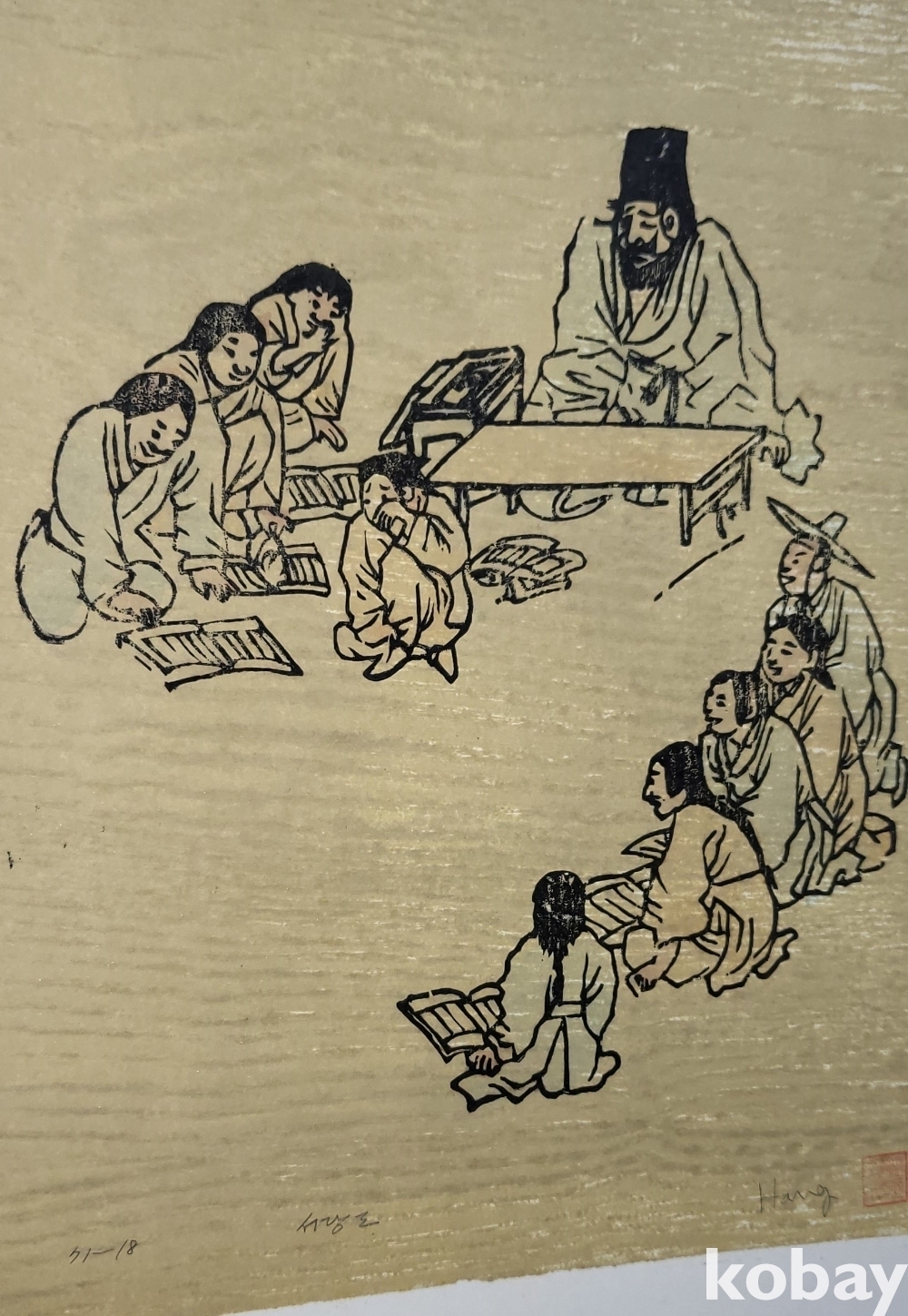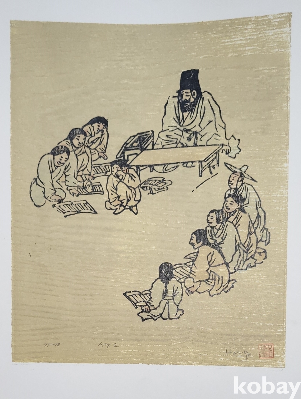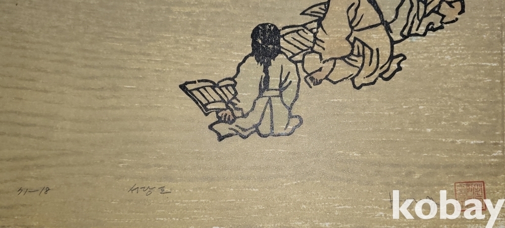 한국풍속판화로 1972년 한국판화 박물관에서 제작한 단원 김홍도 " 서당도"목판화입니다,