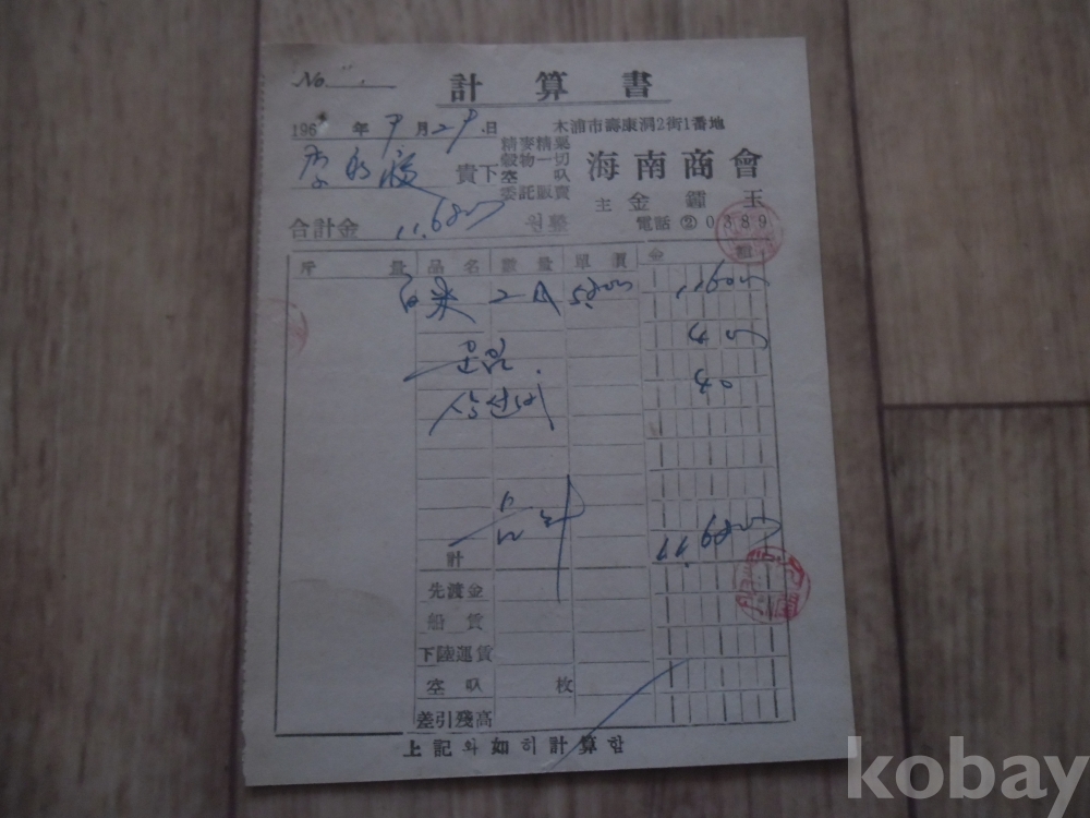 1969년 목포 해남상회 발행 계산서