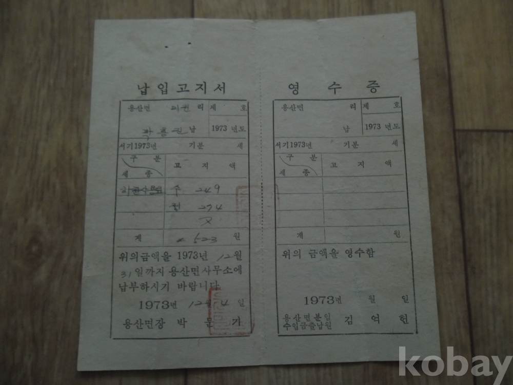 1973년 영동군용산면 발행 하천사용료 납입고지서(영수증)