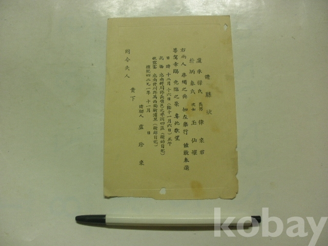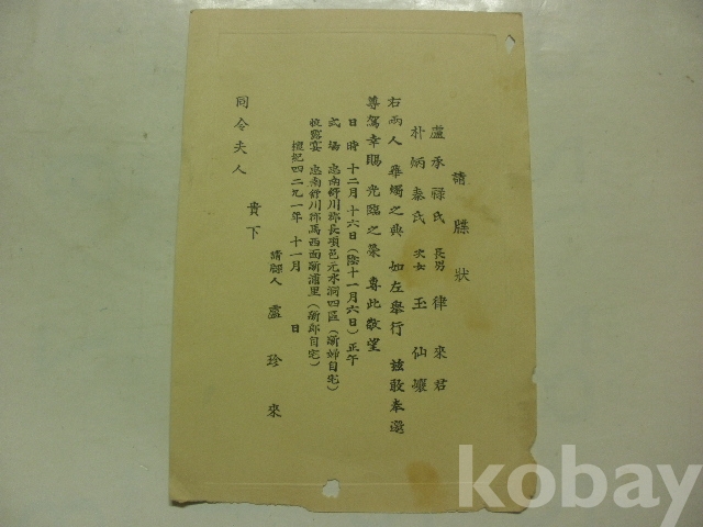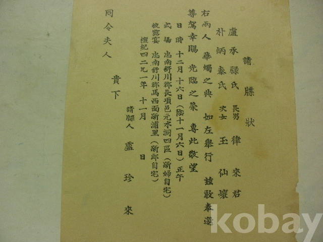 청첩장 - 식장 신부자택, 피로연 신랑자택 (1959년, 충남 서천군 장항읍, 마서면)