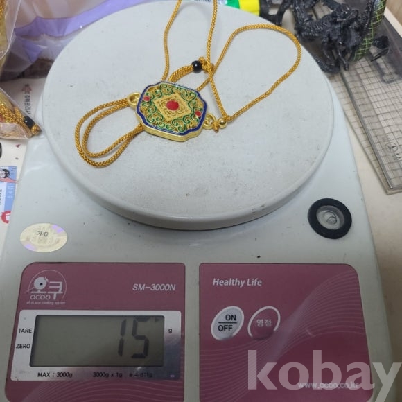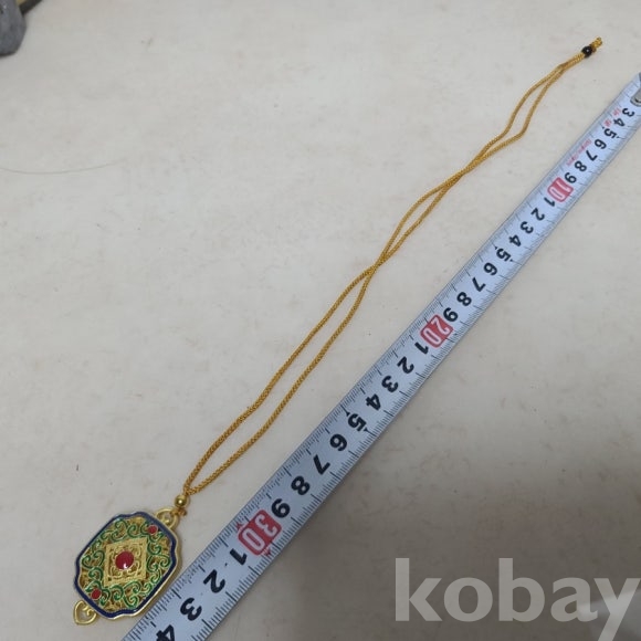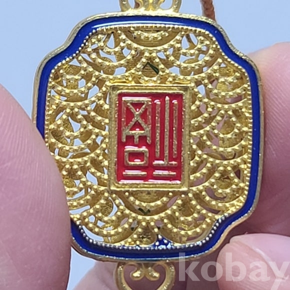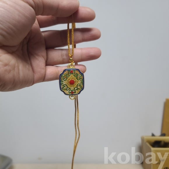 금빛의 동제품에 칠보 기벞으로 장식한 목걸이 형 노리개입니다. 새제품으로 다양하게 활용할수 있습니다