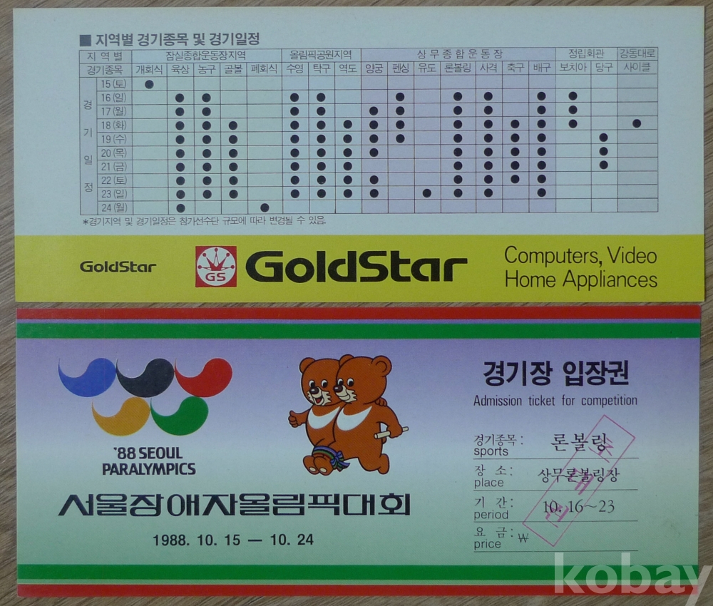 1988년 장애자 올림픽 대회 론볼링 경기장 입장권