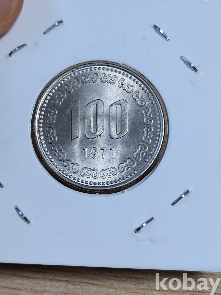 한국주화 - 특년도 1971년 100원 미사용급이나 앞면 오른쪽검은색