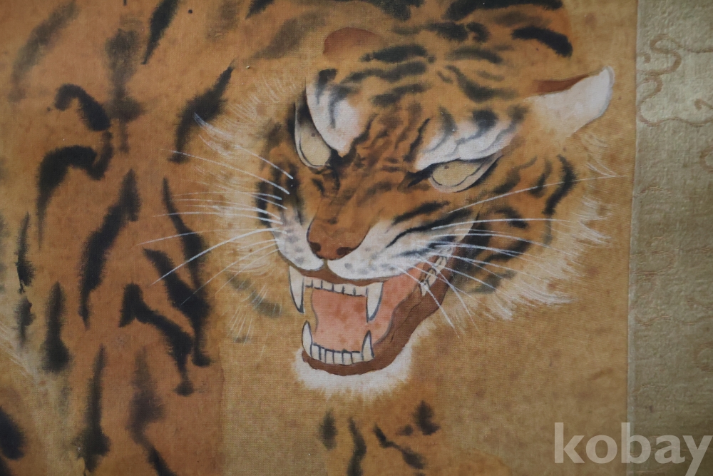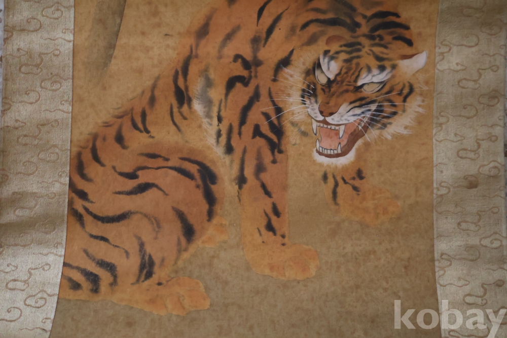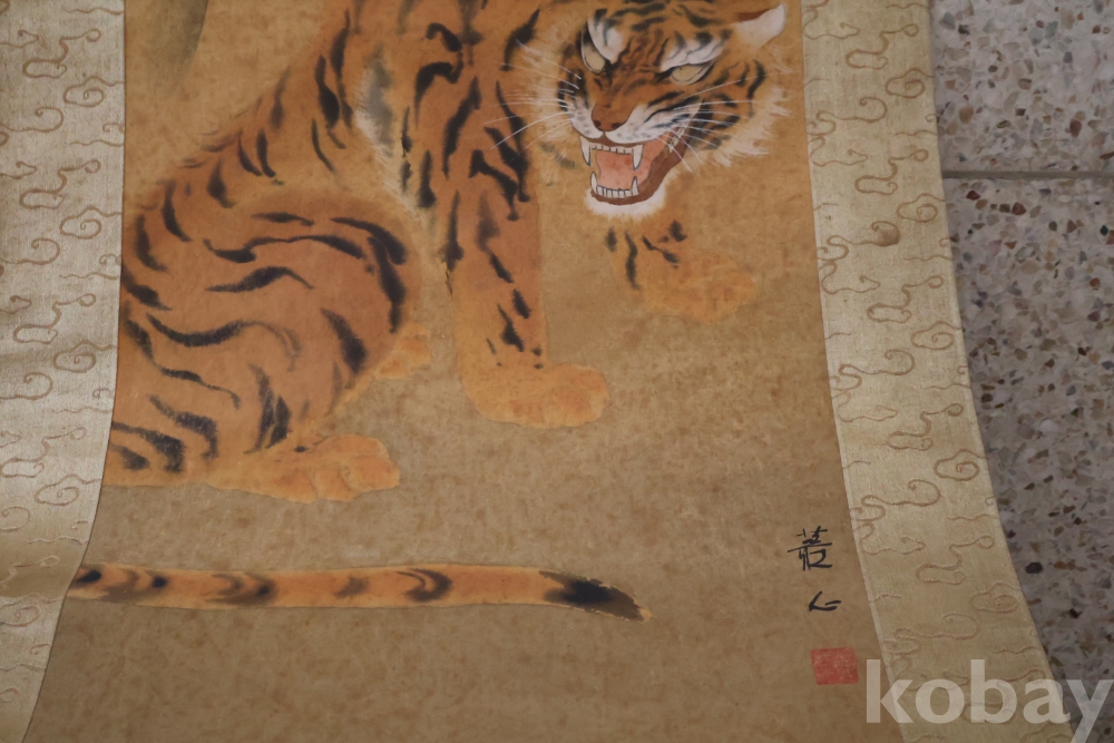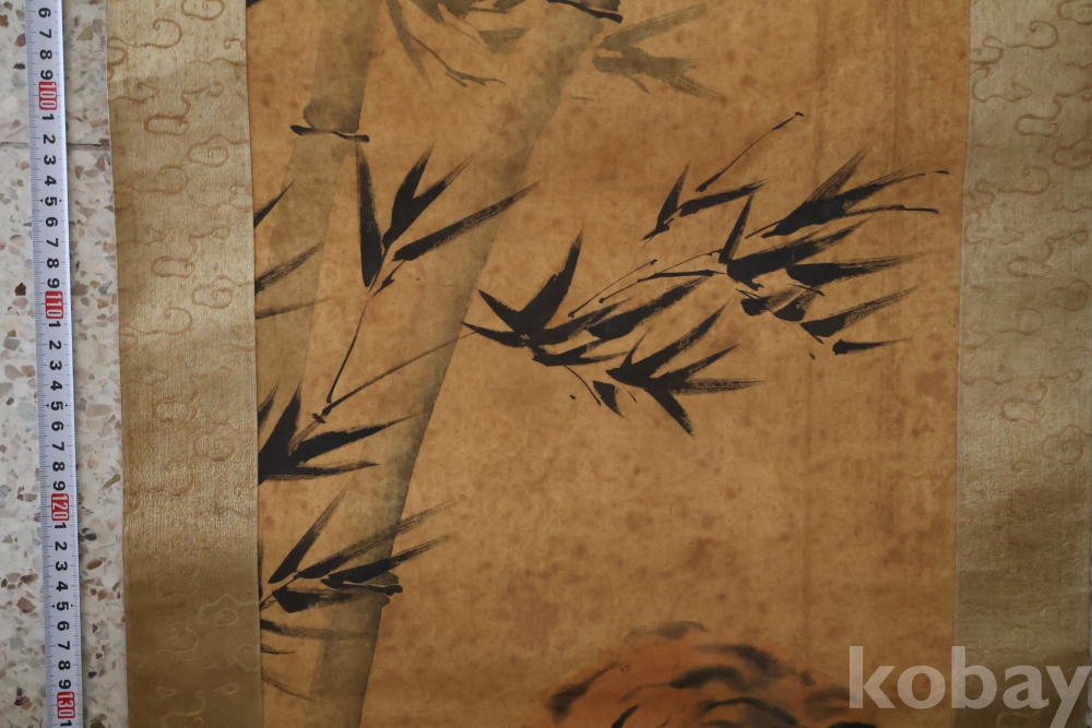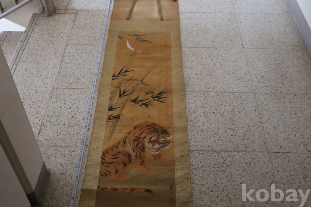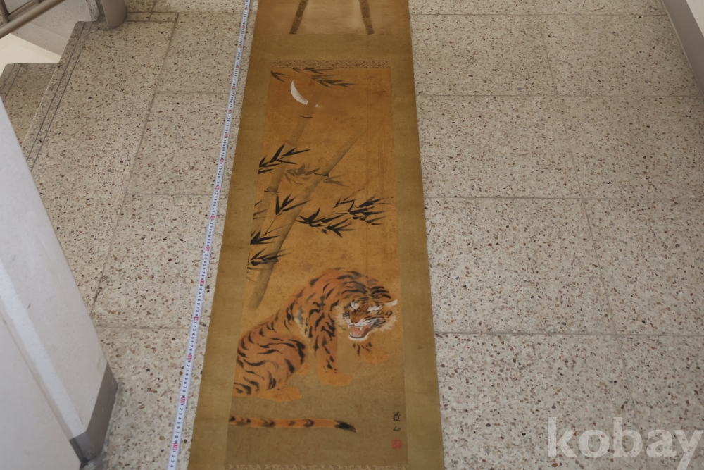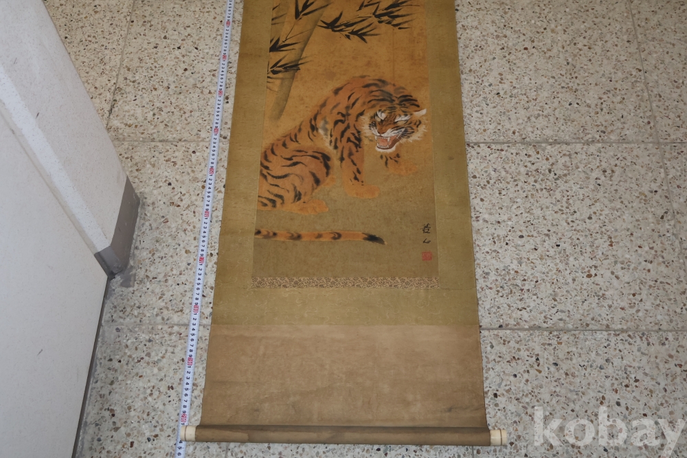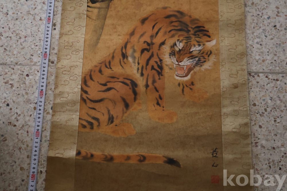 일본 미술 호랑이 족자 고태미를 가진 멋진 호랑이 족자 이며 초생달 대나무 의 배경을 가진 명화 임니다 세월의 흔적을 가진 명화 이며 화가의 낙관이 보심?? 명품 임니다 전체 길이는 203+ -