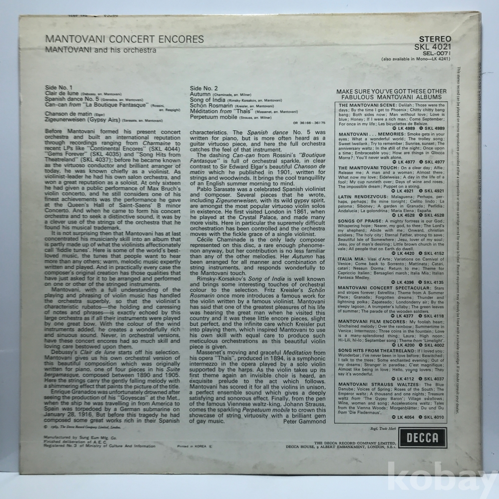 LP 86,050-29 MANTOVANI - CONCERT ENCORES _ 자켓 EX+ 알판 EX 72 년 국내반
