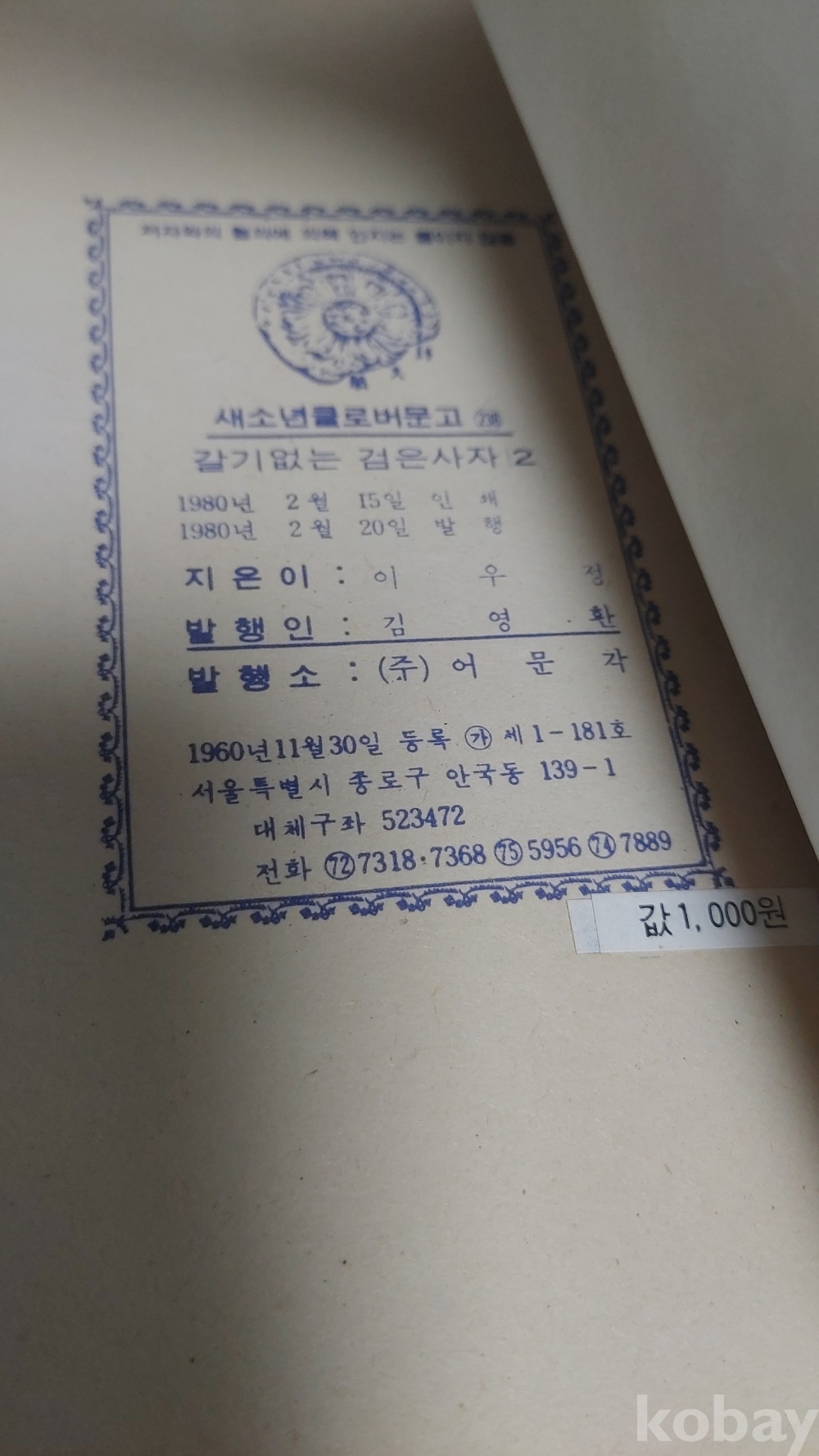 1980년 클로버문고 갈기없는 검은사자 2편 만화책 입니다