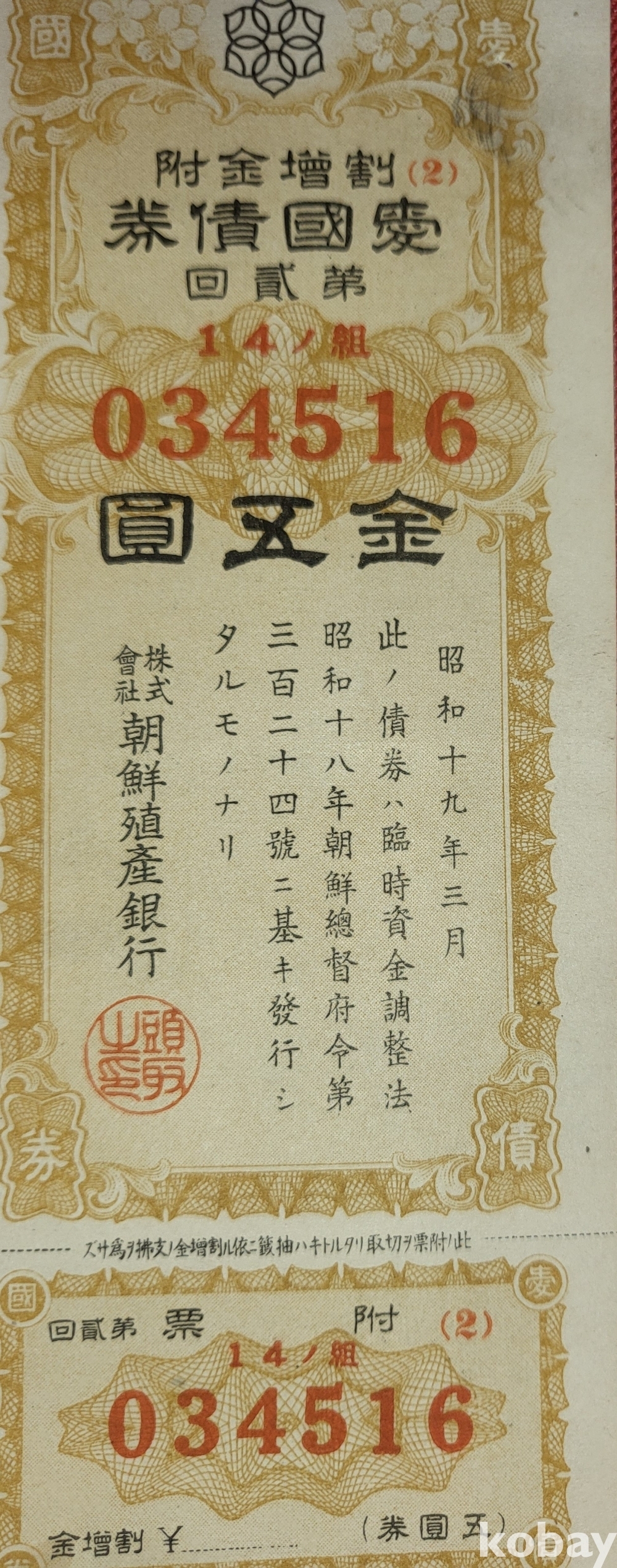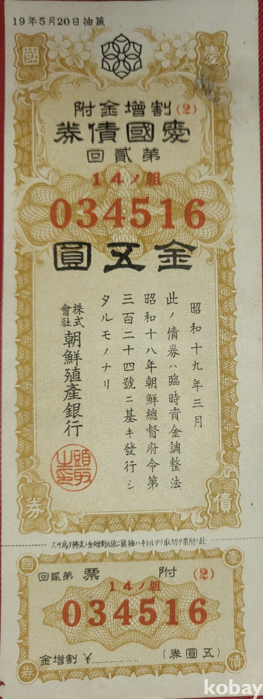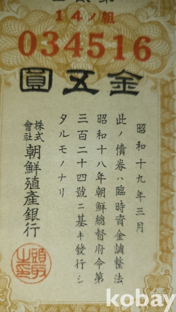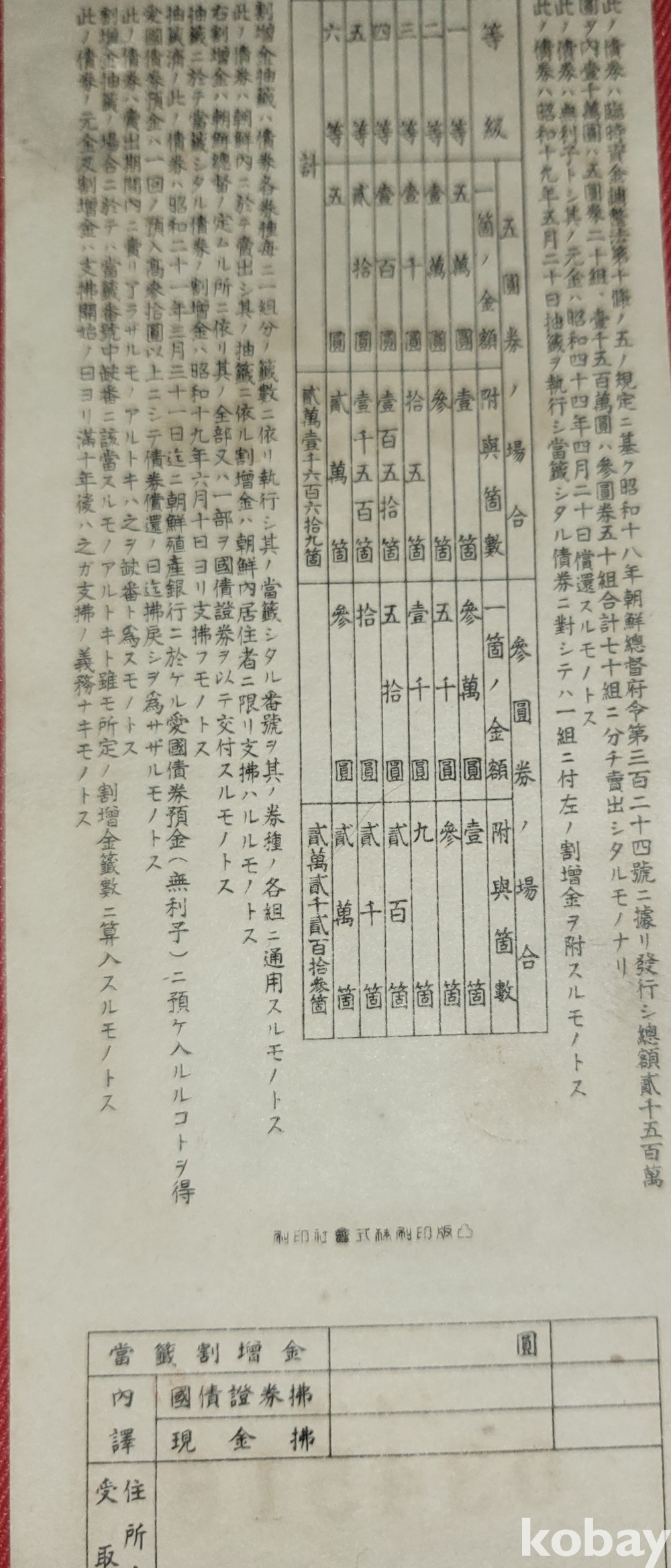 주식회사 조선 직산은행 소하19년(1943년) 발행된 할증금부(割增金附)입니다,