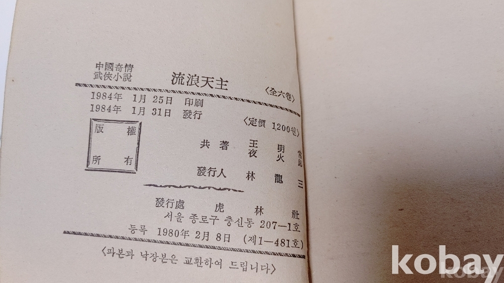1984년 유량천주 무협지 입니다 1권 1편만 없습니다 사진참조