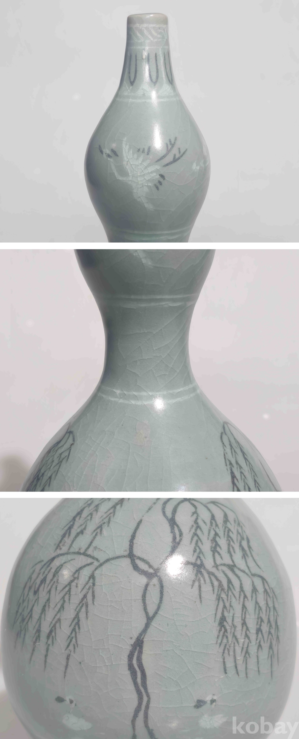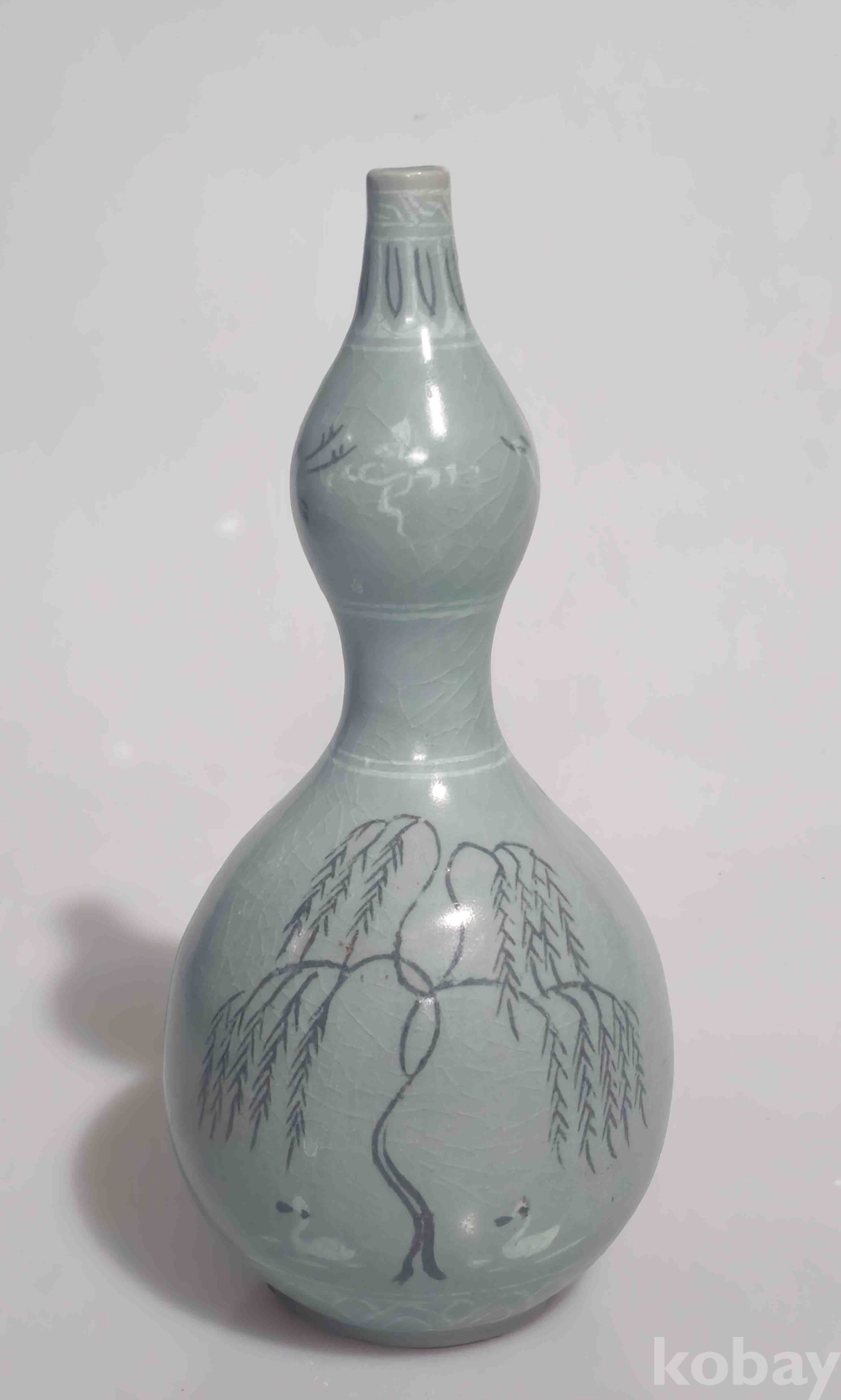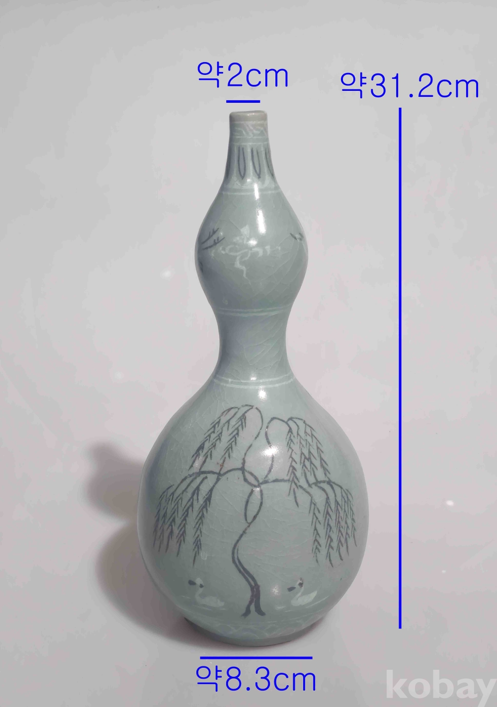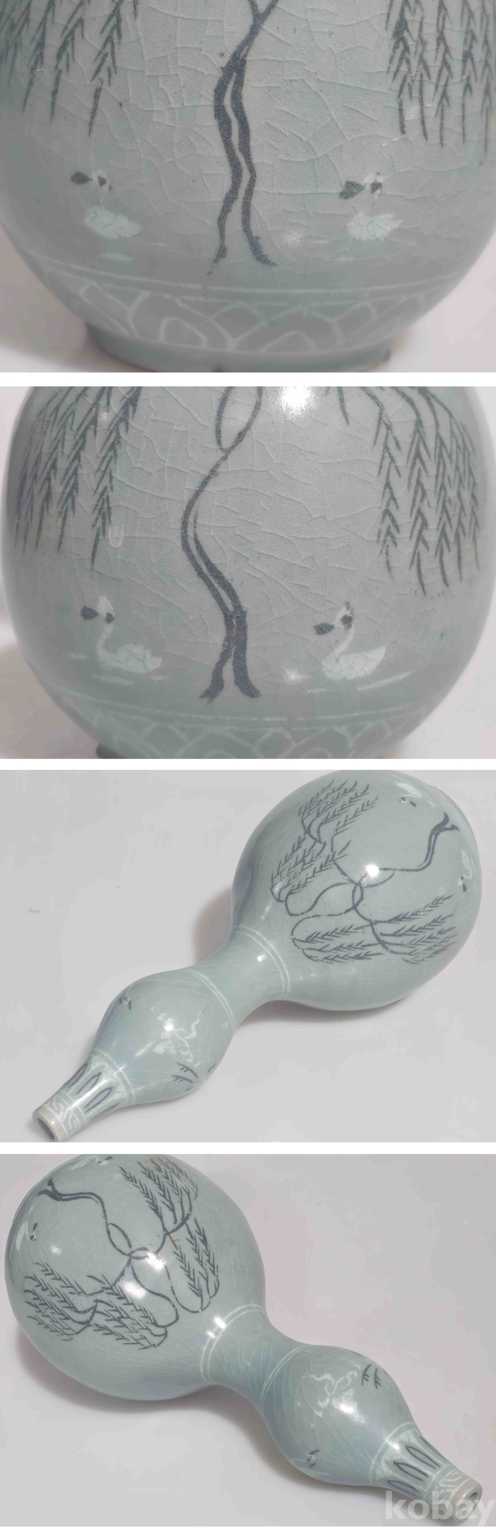 상품 설명 | 연대감 좋은 청자 흑백상감 포류문 대형 호리병입니다. 상태 양호 합니다. 흑백상감으로 위에 운학문 그리고 아래에 포류문을 시문하여 기물의 격을 높였습니다. 참고로 사진은 확대한 상태이며 설명 못한 부분은 사진으로 대체합니다. 흔한 기물이 아니기에 소장의 가치가 높습니다. | ||
