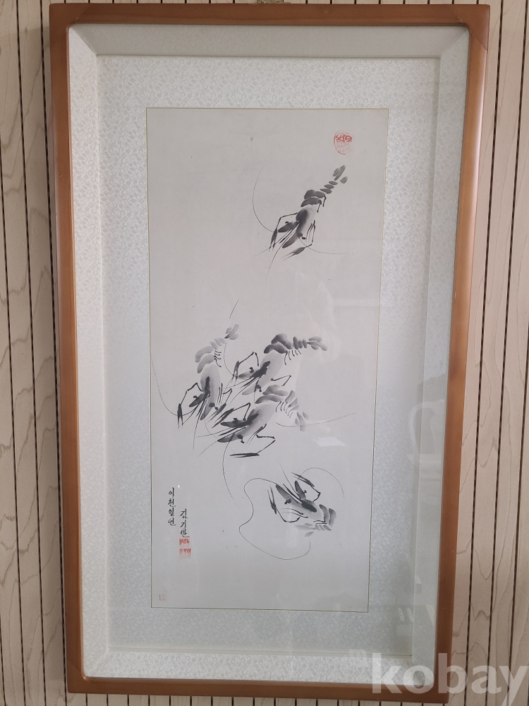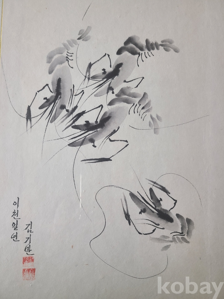 주제 (새우): 김기만 화백은 "새우 그림의 일인자"로 불립니다. 먹의 농담만으로 새우 껍질의 투명함과 힘차게 튀어 오르는 생동감을 표현하는 필력이 압권입니다.