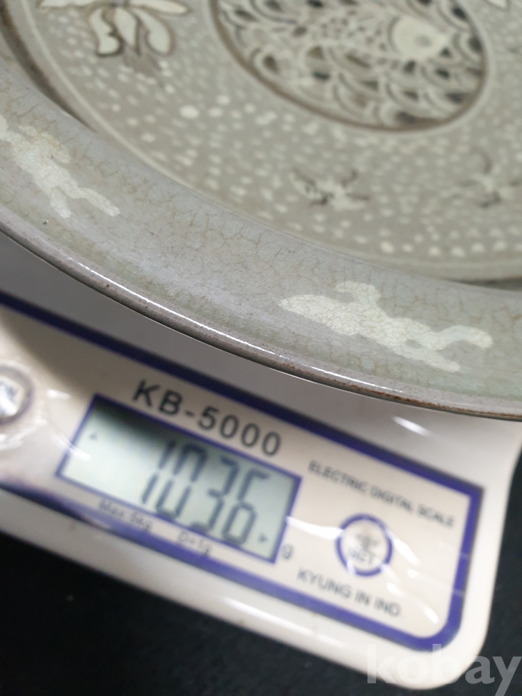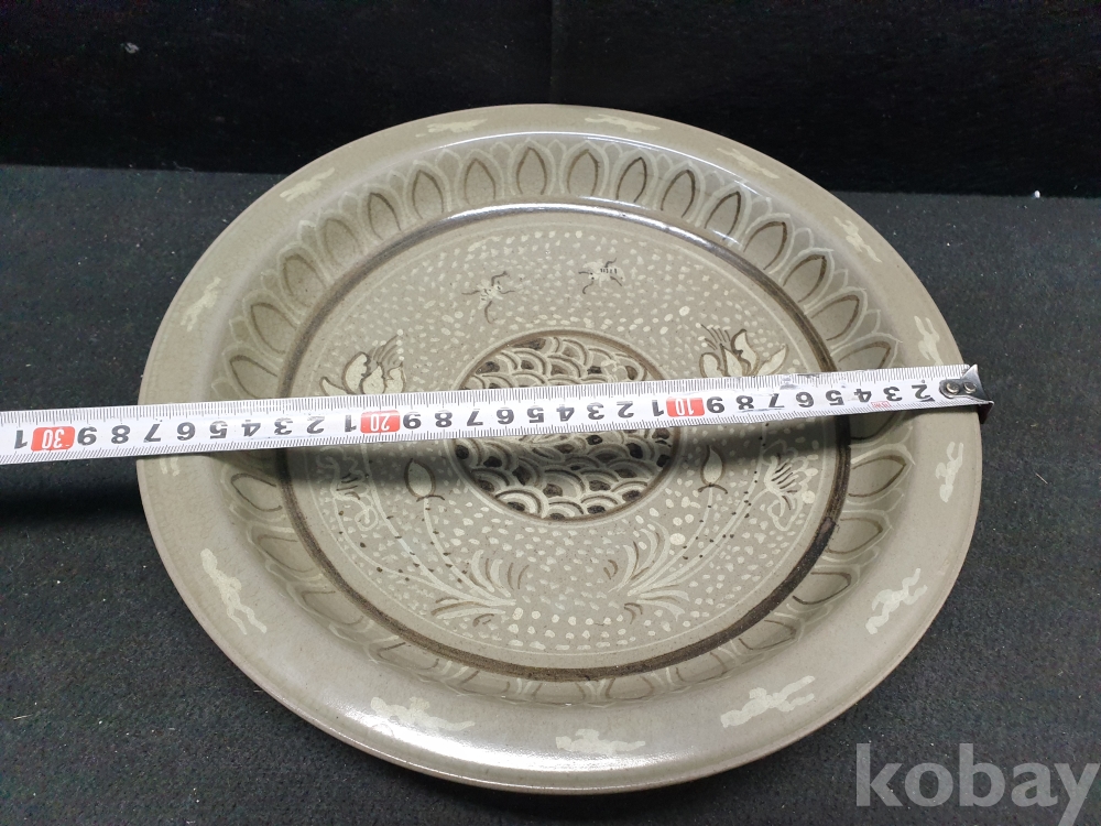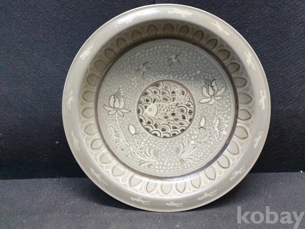 사이즈:높이:5센치.지름:28센치. 무게:1036그람. 설명:큰 사이즈의 섬세한 이쁜 물고기 그림도안의 청자 대반입니다.상태 양호합니다.사진 참고 바랍니다.