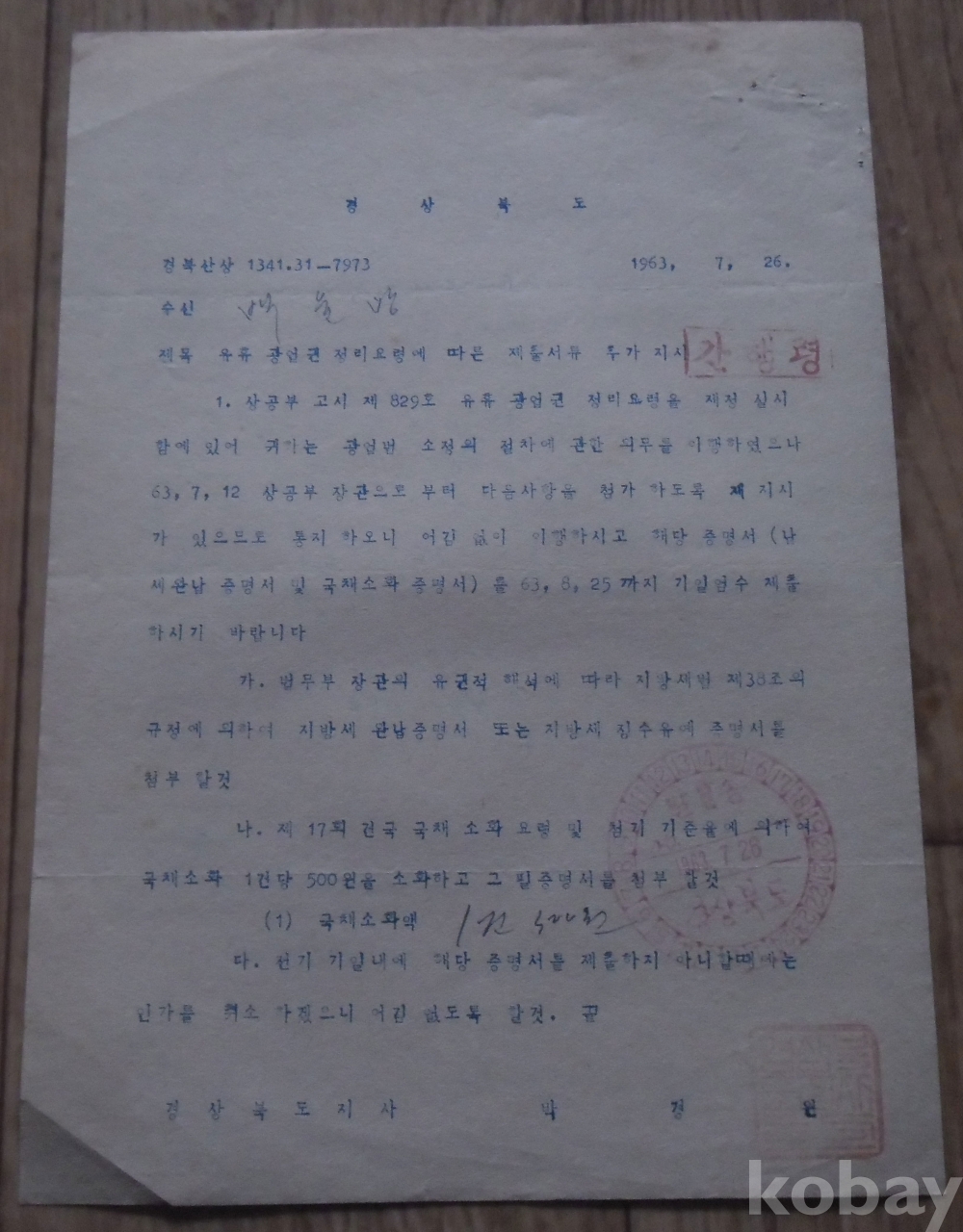 1963년 유휴광업권 정리요령에 따른 제출서류요청(경북)